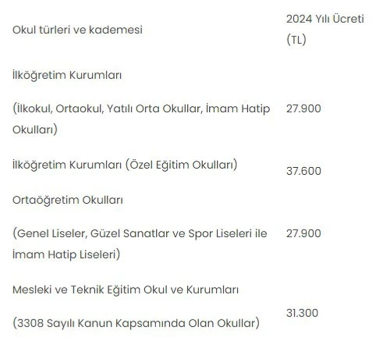 Milli Eğitim Bakanlığı'na bağlı eğitim kurumlarının pansiyon ücretleri yeni yıl için revize edildi. İşte 2024 yılında uygulanacak güncel rakamlar.. 2024 yılı Merkezi Yönetim Bütçe Kanunu Teklifi'nden yapılan derlemeye göre, pansiyon ücretleri ilköğretim kurumları ve ortaöğretim okullarında gelecek yıl 27 bin 900 liraya yükselecek. Mesleki-teknik okul ve kurumlar ile 3308 sayılı Kanun kapsamında olan okulların pansiyon ücretleri de 31 bin 300 liraya çıkacak. İlköğretim kapsamındaki özel eğitim okullarında söz konusu ücretler 37 bin 600 lira olacak. 2024 bütçe teklifiyle belirlenen pansiyon ücretleri şöyle: Kaynak: AA