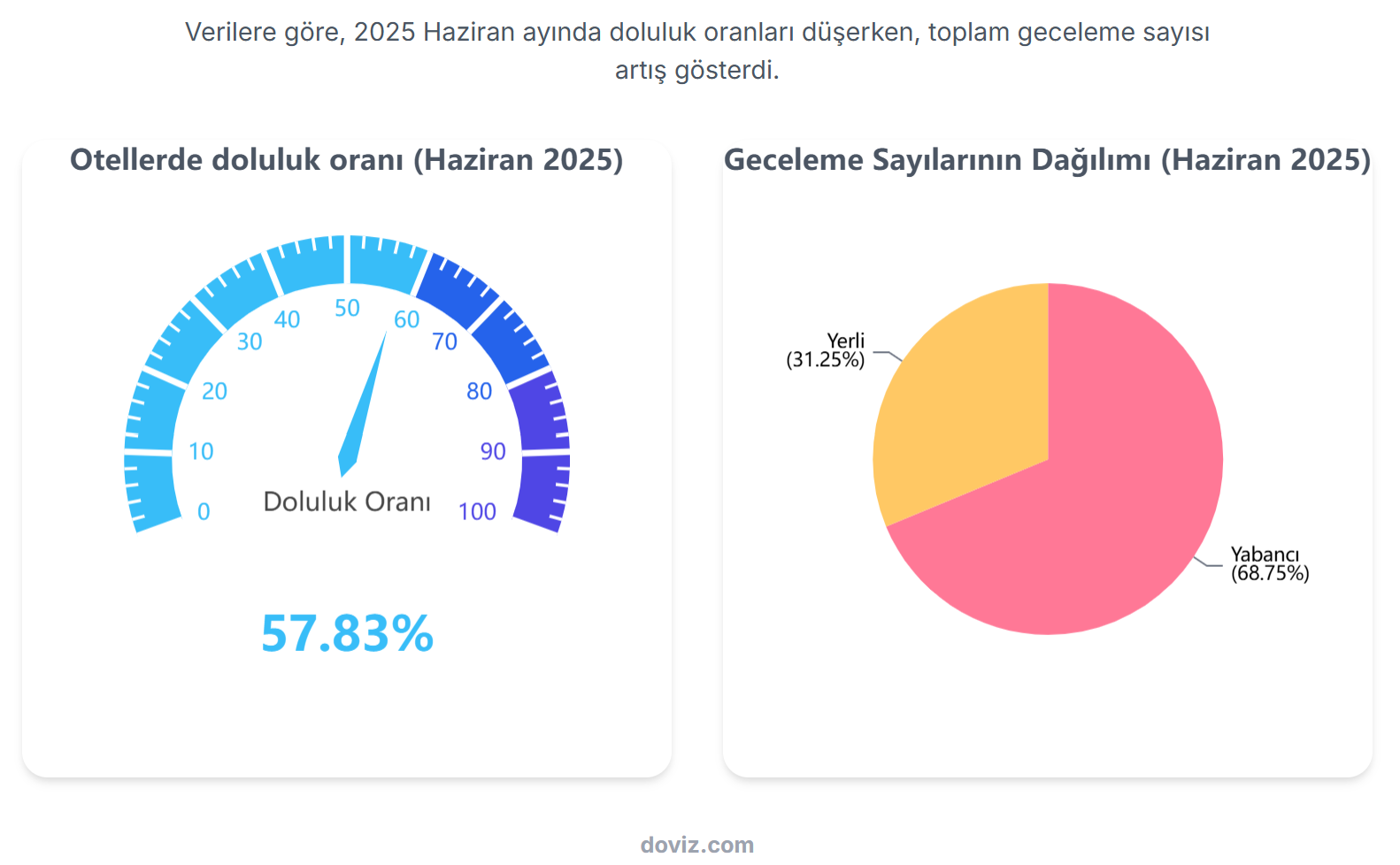 Kültür ve Turizm Bakanlığı verilerine göre haziran ayında otellerde doluluk oranı 4 puan azalarak yüzde 57,83’e geriledi. Kültür ve Turizm Bakanlığı verilerine göre Türkiye genelinde işletme belgeli ve basit belgeli konaklama tesislerinde doluluk oranı Haziran 2025’te geçen yılın aynı ayına kıyasla düşüş göstererek yüzde 57,83 olarak kaydedildi. 2024 yılı Haziran ayında bu oran yüzde 61,95 seviyesindeydi. Kalış süresi uzadı Verilere göre toplam geceleme sayısı bu yılın Haziran ayında 25 milyon 272 bin 640 olarak gerçekleşti. Geçen yılın aynı döneminde bu rakam 24 milyon 591 bin 295 olmuştu. Gecelemelerin 17 milyon 374 bin 638’i yabancı turistler, 7 milyon 898 bin 2’si ise yerli turistler tarafından yapıldı. Bu durum, konaklama tesislerinde yabancı turistlerin ağırlığının sürdüğünü ortaya koydu.