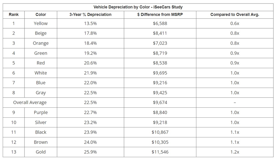 ABD’de 1,3 milyondan fazla 3 yaşındaki ikinci el araç üzerinden yapılan araştırma ile otomobillere en fazla değer kaybettiren renkler belli oldu. iSeecars otomobillerde daha fazla değer kaybettiren renklere yönelik yaptığı araştırmasının sonuçlarını yayımladı. Buna göre, ABD’de 3 yaşındaki ikinci el araçlar üzerinden yapılan araştırma; altın, kahverengi ve siyah renkli otomobillerin en fazla değer kaybettiren araçlar olduğunu ortaya koydu. Ortalama 3 yıl üzerinden hesaplanan değerlere göre; altın yüzde 25,9’la en fazla değer kaybettiren renk olurken; altını sırasıyla yüzde 24 ve yüzde 23,9’la kahverengi ve siyah renkler izledi. Buna karşın en az değer kaybettiren renkler ise sırasıyla sarı, bej ve turuncu oldu. Ortalama 3 yıl üzerinden hesaplanan değerlere göre; sarı yüzde 13,5’le en az değer kaybettiren renk olurken; sarı rengi yüzde 17,8’le bej renk, yüzde 18,4’le de turuncu renk takip etti. Araştırmanın tam listesi şöyle: Kaynak: iseecars Otomotiv gazetecisi Emre Özpeynirci ise Twitter hesabından araştırmayı yayımlayarak şu notu düştü: “İlginç bir araştırma…. Otomobilde hangi renk daha fazla değer kaybettiriyor. iseecars tarafından ABD’de 1,3 milyondan fazla 3 yaşındaki 2.el araç üzerinden yapılan araştırmaya göre, değer kaybı açısından en iyi ve en kötü araç renkleri belirlenmiş. 3 yılın sonunda ortalama bir araç değerinin yüzde 22,5’ini kaybederken, sarı renkli araçlar yalnızca yüzde 13,5’ini, bej yüzde 17,8’ini, turuncu ise yüzde 18,4’ünü kaybediyormuş. Bununla birlikte, altın, kahverengi ve siyah renkteki araçlar ise 3 yılın sonunda en fazla değer kaybını yaşıyorlar. Türkiye için sorun yok, zaten hepsi ya siyah ya gri, en fazla beyaz.“