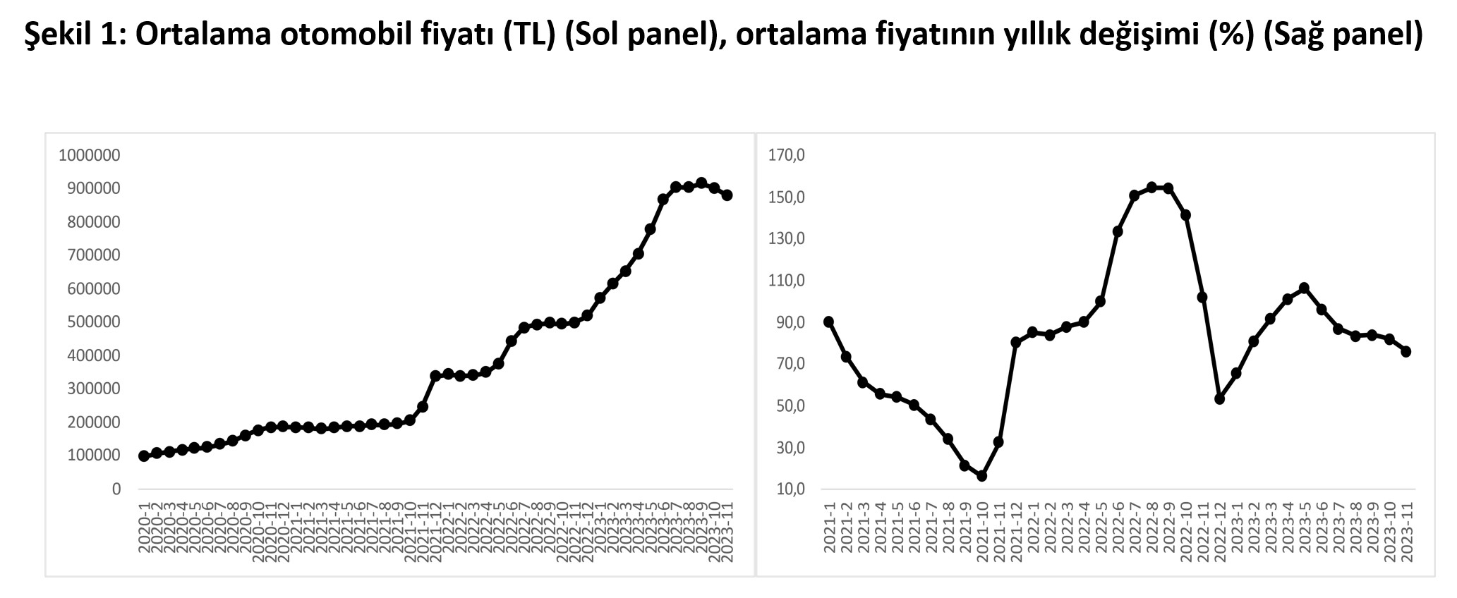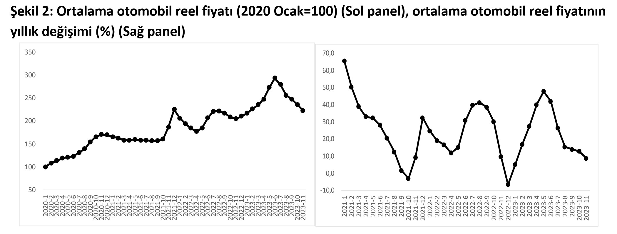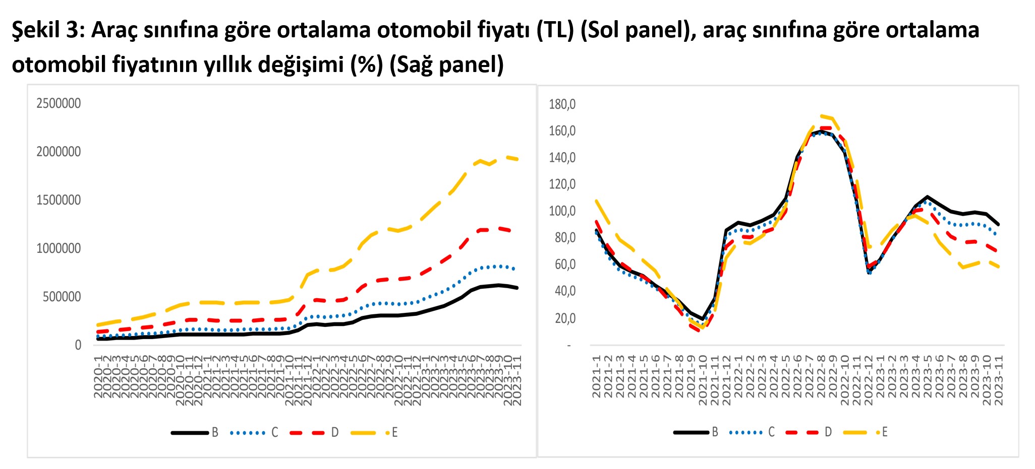 Bahçeşehir Üniversitesi Ekonomik ve Toplumsal Araştırmalar Merkezi (BETAM) ve Sahibinden tarafından hazırlanan rapora göre, otomobil fiyatlarında mayısta yüzde 47,9’a ulaşan reel artış oranı aralık ayı itibarıyla yüzde 0,7’ye gerileyerek durağanlaştı. Bahçeşehir Üniversitesi Ekonomik ve Toplumsal Araştırmalar Merkezi (BETAM) ve Sahibinden tarafından hazırlanan "Otomobil Piyasası Görünümü" raporu yayımlandı. Rapora göre, satılık otomobillerin ortalama fiyatı geçen yılın aralık ayına göre yüzde 65,9 artarken, kasıma kıyasla yüzde 2,1 düşüş kaydetti. Aralık ayında ortalama otomobil fiyatı ise 860 bin 480 TL oldu. Kaynak: Sahibinden, Betam Reel artış durma noktasında Enflasyondan arındırıldığında otomobillerdeki reel fiyatlar ise altı aydır düşüş kaydediyor. Reel fiyat endeksi son okumada kasıma kıyasla yüzde 5 azalarak 212 oldu. Mayısta yüzde 47,9’a ulaşan yıllık artış oranı ise aralıkta yüzde 0,7’ye inerek reel fiyat artışlarının durma noktasına geldiğini gösterdi. Kaynak: Sahibinden, Betam 2023 Aralık verilerine göre ise tüm araç sınıflarındaki ortalama fiyat düşüşü yaşanırken, lüks otomobillerdeki yavaşlamanın daha fazla olduğu görüldü. Yıllık fiyat artış oranı da B sınıfında yüzde 79,9, C sınıfında yüzde 70,6, D sınıfında yüzde 59,8, E sınıfında ise yüzde 51,9 oldu. Kaynak: Sahibinden, Betam Yaş gruplarına göre en yüksek yıllık artış oranı yüzde 94,2 ile 20 yaş ve üstü yaş grubunda, en düşük artış oranı ise yüzde 53,1 ile 0-3 yaş grubunda gerçekleşti. Ortalama otomobil fiyatı 0-3 yaş grubunda 1 milyon 432 bin lira, 20 yaş ve üstü yaş grubunda ise 356 bin 401 lira olarak kaydedildi. Yakıt türüne göre en yüksek yıllık artış oranı Benzin & LPG türünde (yüzde 81,5), en düşük artış oranı ise Elektrik türünde (yüzde 11,2) görüldü. Otomobilde talep hala güçlü Otomobil talep endeksi ise kasıma kıyasla yüzde 14,1 artarak otomobile yönelik talebin güçlü kalmaya devam ettiğini gösterdi. Otomobil piyasasındaki canlılık göstergesi olarak izlenen satılan otomobil sayısının satılık ilan sayısına oranı da 3 puan artarak yüzde 16,9 oldu. [news_id:720628]