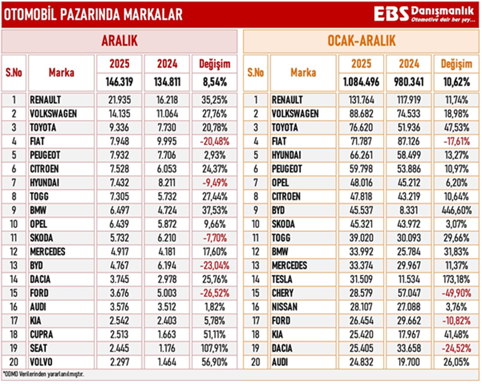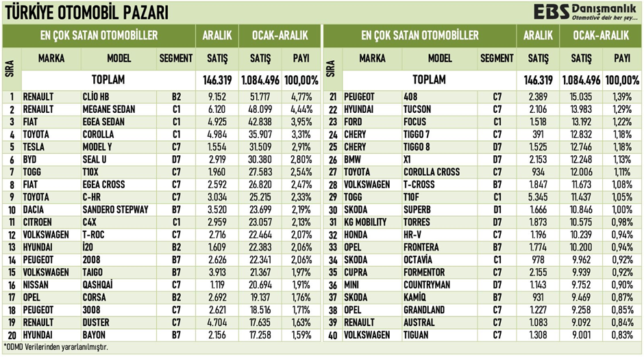Otomotiv pazarı 2025 yılını rekor satış rakamlarıyla kapattı. Otomotiv Distribütörleri ve Mobilite Derneği (ODMD) verilerine göre 2025'te 1,3 milyon adedi aşan satış gerçekleşti. Peki, bu dönemde en çok satan otomobil marka ve modelleri neler oldu? İşte detaylar.. Otomotiv Distribütörleri ve Mobilite Derneği (ODMD) verilerine göre Türkiye otomobil ve hafif ticari araç pazarı 2025 yılının aralık ayında geçen yılın aynı dönemine göre yüzde 12,25 artarak 191 bin 620 adet oldu. Aralık ayında otomobil satışları yüzde 8,54 artışla 146 bin 319 adede, hafif ticari araç satışları ise yüzde 27,83 artışla 45 bin 301 adede yükseldi. Böylece otomotiv pazarı, son 10 yılın aralık ortalamasına göre yüzde 57,9 büyüme kaydetti. 2025 Ocak-Aralık döneminde ise toplam pazar geçen yılın aynı dönemine kıyasla yüzde 10,49 artarak 1 milyon 368 bin 400 adede ulaştı. Bu dönemde otomobil satışları yüzde 10,62 artışla 1 milyon 84 bin 496 adet, hafif ticari araç satışları ise yüzde 9,97 artışla 283 bin 904 adet olarak kaydedildi. Yılın en çok satan markaları Otomotiv gazetecisi Emre Özpeynirci’nin aktardığı bilgiye göre 2025 yılında otomobil satışlarında Renault açık ara liderliğe oturdu. Renault 131 bin 764 adet otomobil satışıyla zirvede yer alırken, Volkswagen 88 bin 682 adetle ikinci, Toyota ise 76 bin 620 adetle üçüncü sırada yer aldı. BYD, 45 bin 537 adetle listeye 9. sıradan girerken, Togg 39 bin adetle 11., Tesla ise 31 bin 509 adetle 14. sırada yer aldı. 2025 yılının en çok satan modelleri 2025 yılının en çok satan otomobilleri incelendiğinde ise zirvenin 51 bin 717 satışla Renault Clio’da olduğu görüldü. Clio’yu 48 bin 99 satışla Megane, 42 bin 838 satışla Egea Sedan takip etti. Corolla’nın 35 bin 907 satış rakamına ulaştığı 2025 yılında, Tesla Model Y satışı 31 bin 509 oldu. [news_id:790252] [news_id:775637]