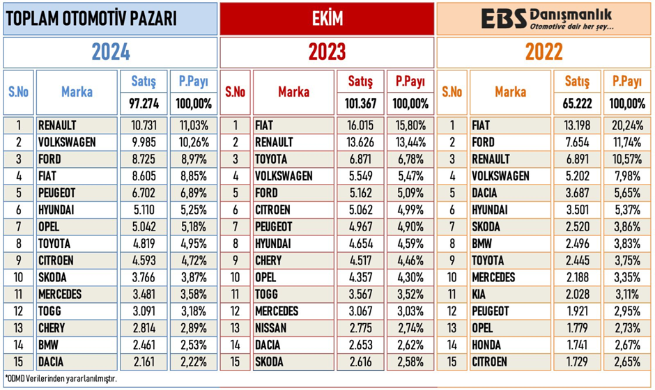 Otomotiv Distribütörleri ve Mobilite Derneği (ODMD), yılın ilk 10 ayında otomobil ve hafif ticari araç pazarının bir önceki yılın aynı dönemine göre yüzde 1,2 daraldığını duyurdu. Peki, ilk 10 ayda en çok satan markalar hangileri oldu? İşte detaylar.. Ekim ayında ise otomobil ve hafif ticari araç pazarı ekimde geçen yılın aynı dönemine göre yüzde 4 azalarak 97 bin 274 adet oldu. Otomobil satışları ekimde bir önceki yılın aynı ayına göre yüzde 8,4 azalarak 75 bin 662 olurken, hafif ticari araç pazarı yüzde 15,2 artarak 21 bin 612'ye yükseldi. Öte yandan otomobil ve hafif ticari araç pazarı, 10 yıllık ekim ayı ortalama satışlara göre yüzde 40,1 arttı. 10 yıllık ekim ayı ortalama satışlara göre, otomobil pazarı yüzde 41 artış gösterirken hafif ticari araç pazarı da yüzde 37,1 arttı. Pazarın yüzde 86,3'ünü vergi oranları düşük olan A, B ve C segmentlerindeki araçlar oluşturdu. C segmenti otomobiller 415 bin 671 adetle yüzde 55,4 pay, B segmenti otomobiller 228 bin 142 adetle yüzde 30,4 pay aldı. Gövde tiplerine göre değerlendirildiğinde ise en çok tercih edilen gövde tipi yüzde 56,2 pay ve 422 bin 374 satışla SUV otomobiller oldu. SUV otomobilleri, yüzde 25,8 pay ve 193 bin 540 satış ile sedan, yüzde 16,8 pay ve 126 bin 477 adet satışla H/B otomobiller takip etti. Satışlardan benzinli otomobiller 471 bin 900 ile yüzde 62,8 pay, hibrit otomobiller 126 bin 977 ile yüzde 16,9 pay, dizel otomobiller 77 bin 113 ile yüzde 10,3 pay, elektrikli otomobiller 69 bin 744 ile yüzde 9,3 pay ve otogazlı otomobiller 5 bin 201 ile yüzde 0,7 pay aldı. 160 kW altındaki elektrikli otomobil satışları yüzde 76,4 artarak yüzde 7,6 paya, 160 kW üstü elektrikli otomobil satışları yüzde 23,3 azalarak yüzde 1,7 paya sahip oldu. 1600cc altındaki otomobil satışları yüzde 10,7 azalarak yüzde 73 pay, 1600-2000cc aralığındaki otomobil satışları yüzde 2,1 düşüşle yüzde 0,6 pay, 2000cc üstü otomobil satışları yüzde 20,6 azalışla yüzde 0,2 pay aldı. Otomatik şanzımanlı otomobiller 682 bin 809 ile yüzde 90,9 pay alırken, manuel şanzımanlı otomobiller 68 bin 126 adetle yüzde 9,1 paya ulaştı. Van gövde tipi yüzde 73,7 pay ve 144 bin 542 adet ile en çok tercih edilen gövde tipi olurken, kamyonet gövde tipi yüzde 13,1 pay ve 25 bin 794 adetle ikinci sırada yer aldı. Otomotiv gazetecisi Emre Özpeynirci'nin aktardığına göre 2024 yılı satışlarından en yüksek payı alan markalar ise şunlar oldu: Kaynak: Emre Özpeynirci - X [news_id:751474]