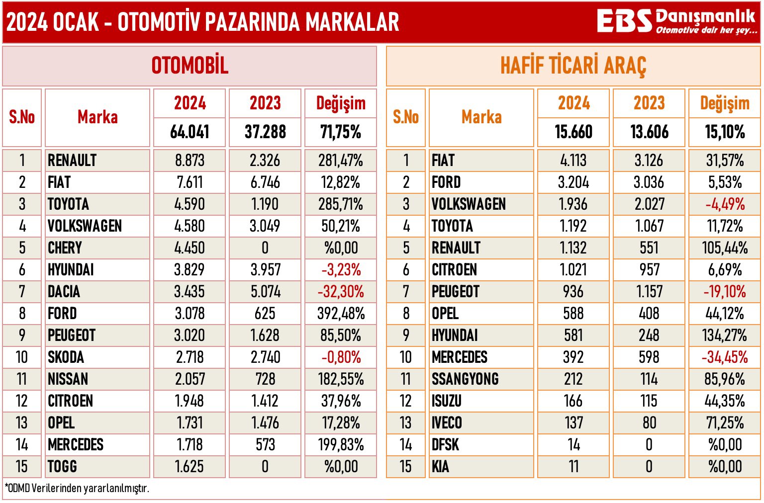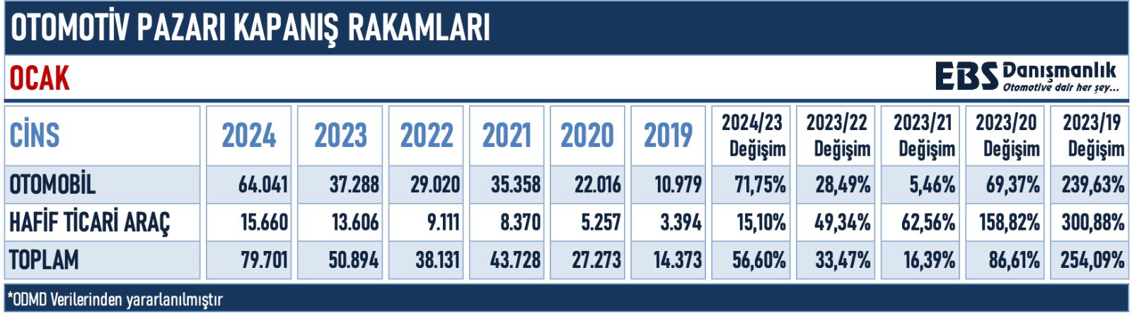 ODMD verilerine göre Türkiye’de otomobil satışları ocakta tüm zamanların en yüksek rakamına ulaştı. Peki, en çok satan markalar hangileri oldu? İşte detaylar.. Otomotivde satışlar yeni yılın ilk ayına hızlı başladı. Otomotiv Distribütörleri ve Mobilite Derneği (ODMD) verilerine göre otomobil satışları Ocak 2024'te geçen yılın aynı ayına göre yüzde 71,7 artarak 64 bin 41, hafif ticari araç pazarı yüzde 15,1 artarak 15 bin 660 adet oldu. Böylelikle Türkiye otomobil ve hafif ticari araç toplam pazarı, 2024 yılı Ocak ayında bir önceki yılın aynı ayına göre %56,6 oranında artarak 79.701 adet olarak gerçekleşti. Bu rakam ise tüm zamanların en iyi ocak ayına işaret etti. Kaynak: Emre Özpeynirci - X EBD Danışmanlık tarafından ODMD verilerinden derlenen bilgiye göre ise 2024 yılı otomotiv satışlarının lideri 8 bin 873 araç satışıyla Renault oldu. Fiat ve Toyota ise sırasıyla 7 bin 11 ve 4 bin 590 araç satışıyla 2024 yılında zirvede kendisine yer bulan markalar oldu. Kaynak: Emre Özpeynirci - X Toplam otomotiv pazarı içerisinden Fiat yüzde 14,71, Renault yüzde 12,55 pay alırken en çok payı alan üçüncü marka ise yüzde 8,18 ile Volkswagen oldu. Segment ve gövde tiplerine göre araç satışları Pazarın yüzde 89,6'sını vergi oranları düşük olan A, B ve C segmentlerindeki araçlar oluşturdu. C segmenti otomobiller 40 bin 279 adetle yüzde 62,9 pay, B segmenti otomobiller 16 bin 862 adetle yüzde 26,3 pay aldı. Gövde tiplerine göre değerlendirildiğinde ise en çok tercih edilen SUV otomobiller (yüzde 52,6 pay, 33 bin 705 adet) oldu. SUV otomobilleri, yüzde 30,3 pay ve 19 bin 407 adet satışla sedan, yüzde 15,3 pay ve 9 bin 827 adet satışla H/B otomobiller takip etti. Benzinli otomobil satışları 41 bin 212 adetle yüzde 64,4 pay, hibrit otomobil satışları 10 bin 206 adetle yüzde 16 pay, dizel otomobil satışları 8 bin 55 adetle yüzde 12,6 pay, elektrikli otomobil satışları 3 bin 973 adetle yüzde 6,2 pay ve otogazlı otomobil satışları 541 adetle yüzde 0,8 pay aldı. Öte yandan 160 kilovat altındaki elektrikli otomobil satışlarının oranı yüzde 453,1 arttı. 160 kilovat üstü elektrikli otomobil satışlarının payı ise yüzde 34,5 artış kaydetti. [news_id:722260]