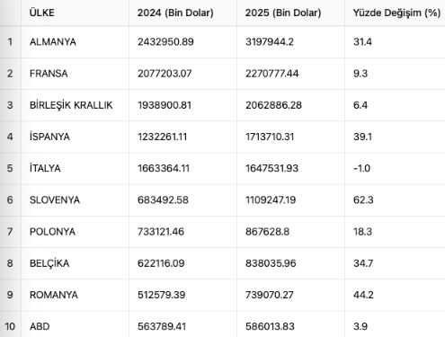 Otomotiv endüstrisi, 2025'in ilk yarısında ulaştığı 19 milyar 986 milyon 716 bin dolarlık ihracatla tarihinin en yüksek ocak-haziran dönemi performansını sergiledi. Türkiye İhracatçılar Meclisi verilerine göre, sektörün toplam ihracattaki payı yüzde 15,2 olarak ölçüldü. ABD'nin küresel ticarette uyguladığı korumacı yaklaşımlar, özellikle otomotiv sektörü için yeni belirsizlikler doğururken, Türkiye bu dönemi yükselişle kapattı. ABD Başkanı Donald Trump’ın Japonya ve Güney Kore’ye gönderdiği "tarife mektuplarında" 1 Ağustos’tan itibaren bu ülkelerden gelen tüm ürünlere sektör fark etmeksizin yüzde 25 gümrük vergisi uygulanacağı bildirildi. Hâlihazırda otomobiller için geçerli olan yüzde 25'lik vergiye eklenebileceği değerlendirilen yeni düzenleme, Japon ve Koreli üreticiler açısından strateji değişimlerini gündeme taşıdı. Avrupa pazarı Türkiye’yi taşıdı Türk otomotiv sektörü, salgın sonrası yakaladığı ivmeyi korumayı başardı. Almanya 3 milyar 197 milyon 944 bin dolarlık dış satımla en çok ihracat yapılan ülke olurken, onu 2 milyar 270 milyon 777 bin dolarla Fransa, 2 milyar 62 milyon 886 bin dolarla Birleşik Krallık, 1 milyar 713 milyon 710 bin dolarla İspanya ve 1 milyar 647 milyon 531 bin dolarla İtalya izledi. Değer bazında ihracat artışında Almanya 765 milyon dolarlık farkla zirvede yer aldı. Slovenya’ya yapılan ihracat yüzde 62,3 artışla 1 milyar 109 milyon 247 bin dolara ulaşırken, İspanya'ya artış oranı yüzde 39,1, Romanya’ya yüzde 44,2 ve Belçika’ya yüzde 34,7 olarak kaydedildi. İller bazında liderlik Kocaeli’de Ocak-haziran döneminde otomotiv ihracatında 6 milyar 300 milyon dolarla ilk sırayı Kocaeli aldı. Bursa 4 milyar 300 milyon dolarla ikinci, İstanbul 4 milyar 200 milyon dolarla üçüncü sırada yer aldı. Sakarya'dan 2 milyar 200 milyon dolarlık, Ankara’dan ise 769 milyon 200 bin dolarlık ihracat yapıldı. Geçmiş yıllara göre güçlü artış Otomotiv endüstrisi 2024’ün aynı döneminde 17 milyar 700 milyon dolarlık dış satım gerçekleştirmişti. Rakam 2023’te 17,3 milyar dolar, 2022’de 15,3 milyar dolar, 2021’de 14,4 milyar dolar ve 2020’de 10,8 milyar dolar olarak gerçekleşmişti. Salgının etkili olduğu bu dönemlerde bile istikrarlı büyüme kaydeden sektör, 2025’in ilk 6 ayında performansını zirveye taşıdı.