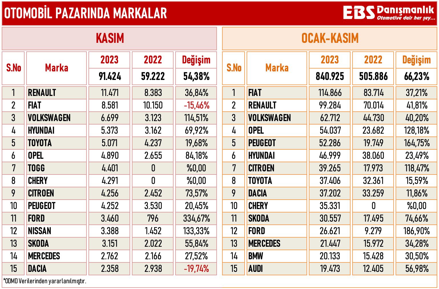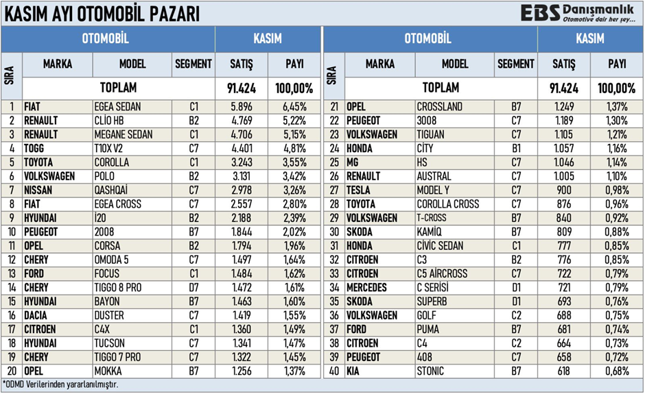 Türkiye'de otomobil ve hafif ticari araç satışı tüm zamanların yıllık rekorunu kırdı. Peki, kasım ayında en fazla hangi marka ve modeller satıldı? İşte detaylar.. Otomotiv Distribütörleri ve Mobilite Derneğinin (ODMD) kasım ayı verilerine göre, Türkiye otomobil ve hafif ticari araç toplam pazarı, ocak-kasım döneminde yıllık bazda yüzde 60,8 büyüdü. Böylece Türkiye otomotiv pazarı tarihinde ilk kez 1 milyon rakamı aşılarak 1 milyon 73 bin 982 satışa imza atıldı. Daha önce en yüksek satış 983 bin 720 adetle 2016 yılında yapılmıştı. Bu yılın 11 ayında otomobil satışları yüzde 66,2 artarak 840 bin 925, hafif ticari araç satışları ise yüzde 43,7 yükselişle 233 bin 57 adet oldu. Kasım ayı özelinde bakıldığında ise otomobil ve hafif ticari araç satışları geçen yılın aynı dönemine göre yüzde 39,8 artarak 115 bin 40'a yükseldi. Geçen ay otomobil satışları yüzde 54,4 artışla 91 bin 424, hafif ticari araç satışları da yüzde 2,3 yükselerek 23 bin 616 olarak kayıtlara geçti. Kasım ayında en çok satan markalar Otomotiv gazetecisi Emre Özpeynirci’nin aktardığına göre kasımda Renault, 11 ay sonunda ise Fiat’ın liderliği devam etti. VW hem kasımda hem 11 ayda üçüncü sırada yer alırken, Hyundai dördüncü sıraya yükseldi. Son 2 aydır kampanya gazına basan Toyota ise kasımda beşinci sırada yer alırken, 11 ay sonunda ise sekizinci sıraya yükseldi. Kaynak: Emre Özpeynirci – X Model bazlı en çok satanlar Markaların model bazlı satışları incelendiğinde ise Egea’nın zirvedeki yerini koruduğu görüldü. Clio ikinci, Megane ise üçüncü sırada kendisine yer buldu. Togg T10X'in dördüncü olduğu listede, Corolla beşinci, Polo ise altıncı sırada yer aldı. Kaynak: Emre Özpeynirci – X [news_id:716685]