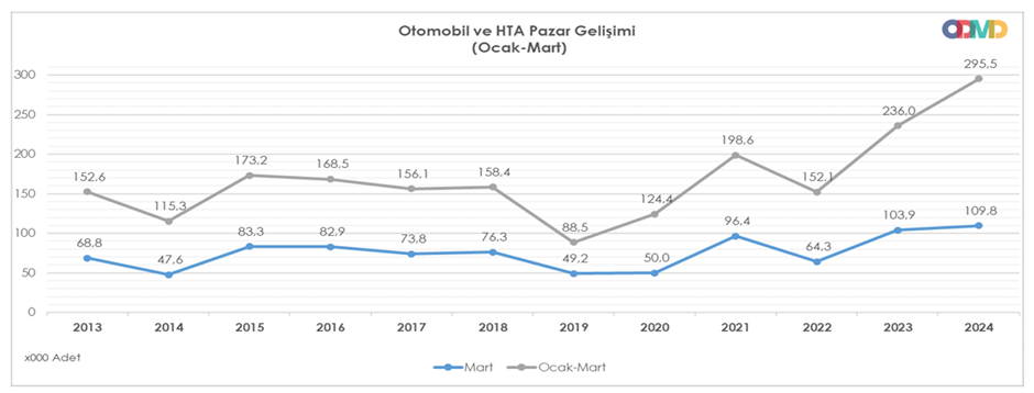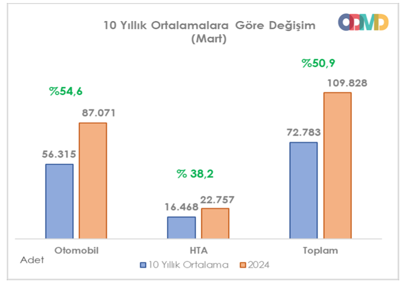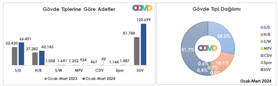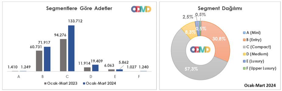 Otomobil ve hafif ticari araç satışları mart ayında 109 bin 828 seviyesine çıkarak tüm zamanların mart rekorunu kırdı. Peki, martta en fazla satan markalar hangileri oldu? İşte detaylar.. Otomotivde talep seçimlerinin olduğu mart ayında da soğumadı. Otomotiv Distribütörleri ve Mobilite Derneği verilerine göre mart ayında toplam otomobil ve hafif ticari araç pazarındaki satışlar, bir önceki yılın aynı dönemine göre yüzde 5,7 artarak 109 bin 828 adet olarak kaydedildi. Böylelikle 2024 Mart ayı satışları, tüm zamanların mart rekorunun kırıldığına işaret etti. Mart ayında otomobil satışları bir önceki yılın aynı ayına göre yüzde 9,9 artarak 87 bin 71 adet olurken, hafif ticari araç satışları ise yüzde 7,9 azalarak 22 bin 757 adet oldu. 10 yıllık ortalamalar Mart aylarının 10 yıllık ortalaması ise 72 bin 783 adet düzeyinde gerçekleşirken, Mart 2024'teki satışlar 10 yıllık ortalamanın da yüzde 50,9 üzerine çıktı. Otomobil satışları da 10 yıllık mart ayı ortalama satışlara göre yüzde 54,6 artış gösterdi. Hafif ticari araç satışları ise 10 yıllık mart ayı ortalama satışlara göre yüzde 38,2 artış kaydetti. Otomobil pazarı segmentlere göre; • Pazarın %88,6’sını vergi oranları düşük olan A, B ve C segmentlerindeki araçlar oluşturdu. • C segmenti otomobiller 133.712 adetle %57,3 pay, • B segmenti otomobiller 71.917 adetle %30,8 pay aldı. Otomobil pazarı gövde tiplerine göre; • Gövde tiplerine göre değerlendirildiğinde ise en çok tercih edilen gövde tipi SUV otomobiller (%51,7 pay, 120.699 adet) oldu. • SUV otomobilleri, %28,5 pay ve 66.451 adet satış ile Sedan, • %18,1 pay ve 42.145 adet satış ile H/B otomobiller takip etti. Otomobil pazarı motor tipine göre; • Benzinli otomobil satışları 156.396 adetle %67 pay, • Hibrit otomobil satışları 33.131 adetle %14,2 pay, • Dizel otomobil satışları 25.268 adetle %10,8 pay, • Elektrikli otomobil satışları 16.556 adetle %7,1 pay ve • Otogazlı otomobil satışları 2.038 adetle %0,9 pay aldı. Martta en fazla satan 3 araç marka Mart ayında marka bazlı incelendiğinde ise Fiat, Renault ve Ford sırasıyla 14.699, 13.155 ve 8.324 satışla zirvede yer aldı. Diğer araç satışları ise şöyle listelendi: Kaynak: ODMD
