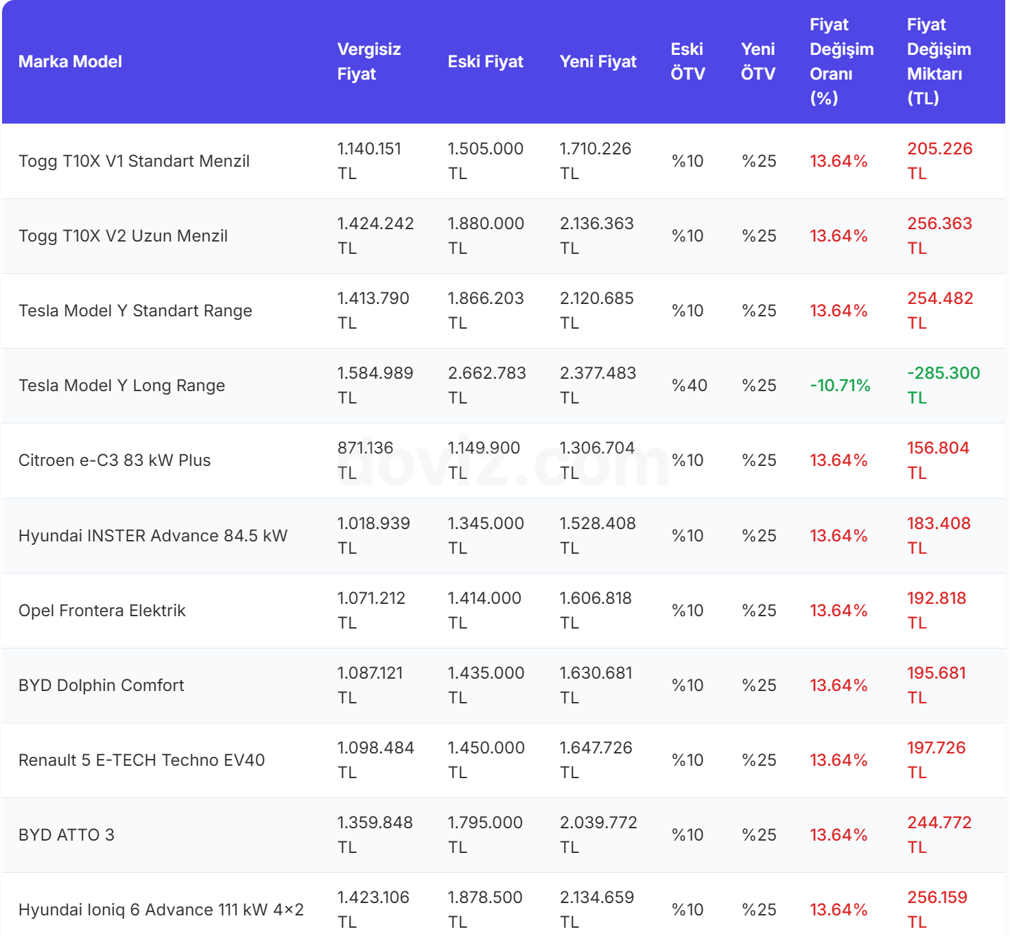 Resmi Gazete'de yayımlanan kararla birlikte, Özel Tüketim Vergisi (ÖTV) oranları baştan sona yenilendi. Peki, ÖTV düzenlemesi sonrası elektrikli araçların yeni fiyatları ne kadar oldu? İşte detaylar.. Resmi Gazete'nin bugünkü sayısında yer alan Cumhurbaşkanı Kararı ile otomobillerde ÖTV hesabı yeniden belirlendi. Yeni düzenlemeye göre, otomobillerdeki ÖTV oranları artık yüzde 70'ten başlıyor ve yüzde 220'ye kadar çıkabiliyor. Elektriklilerde ise en düşük ÖTV oranı yüzde 25 olarak belirlendi. [news_id:779468] Elektrikli araçların çevre dostu ve sürdürülebilir ulaşım için teşvik edilmesi hedeflense de yeni düzenlemelerle birlikte bu araçların da fiyatlarında belirli değişiklikler yaşanması kaçınılmaz hale geldi. Buna göre vergisiz satış fiyatı üzerinde düzenleme yapılmadığı durumda elektrikli araçların fiyatının ortalama yüzde 13,6 artış kaydedeceği hesaplandı. Böylelikle Togg’un T10X V1 RWD Standart Menzil modeli, 1.140.151 TL’lik vergisiz fiyat üzerinden yapılan hesaplamayla yeni vergi oranı sonrası fiyatı 1.710.226 TL seviyesine yükselecek. Tesla’nın Model Y RWD (Standart) versiyonu ise 1.413.790 TL’lik vergisiz satış fiyatının ardından yeni düzenlemeyle 2.120.685 TL’ye satışa çıkacak. Tesla zam yapmazsa Model Y Long Range fiyatı düşecek Yapılan yeni düzenleme kapsamında araç fiyatlarında genel olarak artış beklenirken Tesla Model Y Long Range ve Opel Grandland Elektrik GS gibi modellerin ÖTV baremindeki düşüş nedeniyle fiyatlarında geri çekilme yaşanacak. Tesla Model Y Long Range modelinin vergisiz fiyatına zam yapılmadığı durumda fiyatı 285 bin TL’lik düşüşle 2 milyon 377 bin TL’ye gerileyecek. Opel Grandland Elektrik GS modelinin fiyatında ise yaklaşık 275 bin TL’lik geri çekilme yaşanacak. Yeni ÖTV düzenlemesi sonrası elektrikli araçların fiyatları şöyle olacak: [news_id:779082]