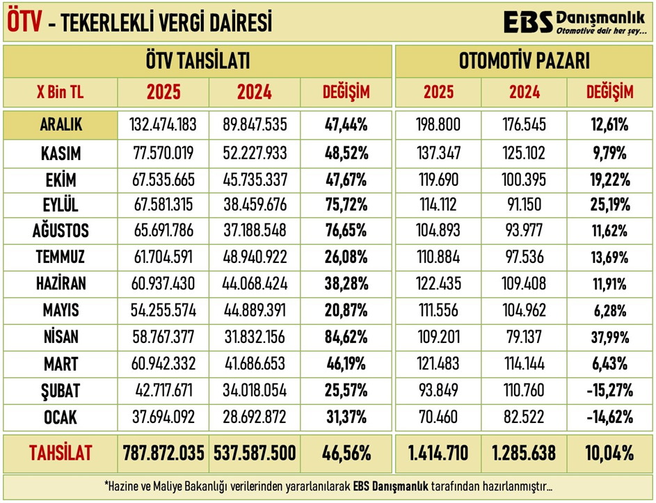 2025 yılında otomotiv pazarı yüzde 10 oranında büyüme kaydederken, Hazine’nin otomotiv satışlarından elde ettiği gelir yüzde 46 oranında artış gösterdi. Böylelikle 2025 yılı için hedeflenen ÖTV tahsilatının yüzde 98,5’i tutmuş oldu. Otomotiv gazetecisi Emre Özpeynirci, sosyal medya hesabı üzerinden yaptığı paylaşımla, 2025 yılında Hazine’nin ÖTV gelirinin rekor düzeye ulaştığını duyurdu. Hazine’nin 2025 ÖTV hedefinin %98,5’ini yakaladığını bildiren Özpeynirci, hedefin tam olarak tutmamasında, 2025’te satılan yaklaşık 190 bin elektrikli otomobilin içten yanmalı modellere kıyasla daha düşük ÖTV ile satılmasının etkili olduğunu söyledi. Özpeynirci, konuya ilişkin paylaşımında şunları aktardı: “Tekerlekli vergi dairesi; 2025'te otomotivden 788 milyar TL ÖTV toplandı. Otomotiv pazarı %10 büyüdü, ÖTV geliri %46 arttı. 2025 yılında ağır ticari araçlar dahil toplam otomotiv pazarı %10 büyüyerek 1 milyon 414 bin 700 adede ulaştı. Ancak asıl dikkat çekici artış devletin vergi gelirinde yaşandı. Otomotivden tahsil edilen ÖTV geliri %46,56 artışla 787 milyar 872 milyon TL’ye çıktı. Özellikle aralık ayı, rekor satışla birlikte rekor tahsilat getirdi. Sadece bir ayda 132,4 milyar TL’yi aşan ÖTV toplandı. Bu performansla Hazine, 2025 ÖTV hedefinin %98,5’ini yakaladı. Yıl sonu sapması ise yalnızca 11,6 milyar TL oldu. Not: Hedefin tam olarak tutmamasında ise 2025’te satılan yaklaşık 190 bin elektrikli otomobilin, içten yanmalı modellere kıyasla daha düşük ÖTV ile satılmasının önemli etkisi oldu.” Kaynak: Emre Özpeynirci [news_id:797591]
