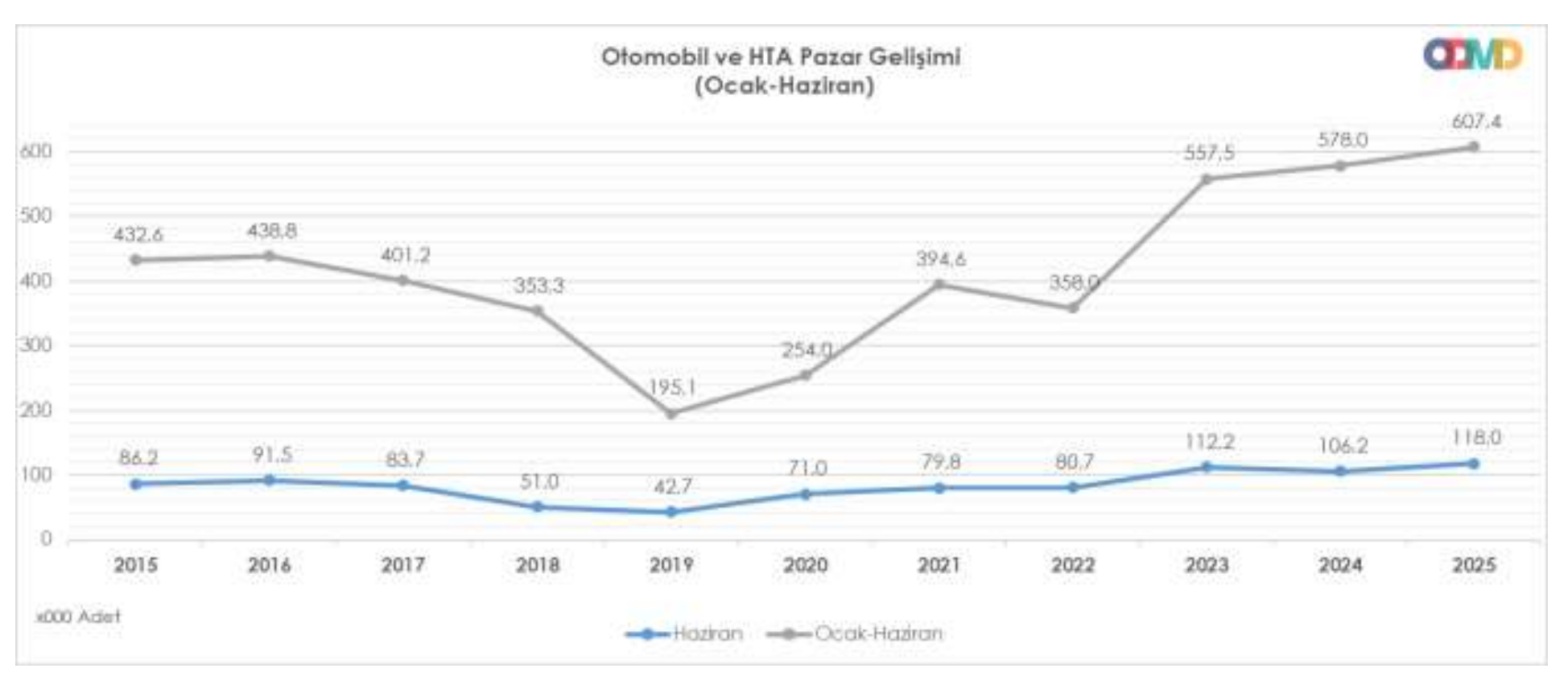 ÖTV’de yapılması beklenen düzenleme öncesinde otomotiv pazarı hem haziran ayını hem de yılın ilk altı ayını tüm zamanların zirvesinde tamamladı. Otomotiv Distribütörleri ve Mobilite Derneği (ODMD) verilerine göre otomobil ve hafif ticari araç toplam satışları haziran ayında geçen yılın aynı ayına kıyasla yüzde 11,1 artarak 118 bin 13 adede ulaştı. Haziran ayında otomobil satışları yüzde 6 oranında artarak 93 bin 676 adet olurken hafif ticari araç satışları geçen yılın aynı dönemine göre yüzde 32,4 artışla 24 bin 337 adede yükseldi. Yılın ilk altı ayında rekor tazelendi 2025 Ocak-Haziran dönemine bakıldığında ise toplam pazar yüzde 5,1 oranında büyüyerek 607 bin 379 adede ulaştı. Bu dönemde otomobil satışları yüzde 5,4 artışla 488 bin 3’e, hafif ticari araç satışları ise yüzde 3,8 artışla 119 bin 376’ya yükseldi. Kaynak: ODMD Otomotiv satışlarındaki artış devam eder mi? Otomotiv Gazetecisi Emre Özpeynirci ise otomotiv satışlarındaki rekor seviyelere ilişkin paylaşımında şunları aktardı: “Haziran’daki bu rekorun temelinde vergi düzenlemesi korkusuyla öne çekilen alımlar yatıyor. Temmuz ayıyla birlikte satışların yavaşlaması muhtemel. Ancak yeni ÖTV oranları açıklanana kadar “Ne olacağı belli olmaz” havası, tüketicinin showroomlara yönelmesini sürdürebilir.” [news_id:777152] [news_id:776592]