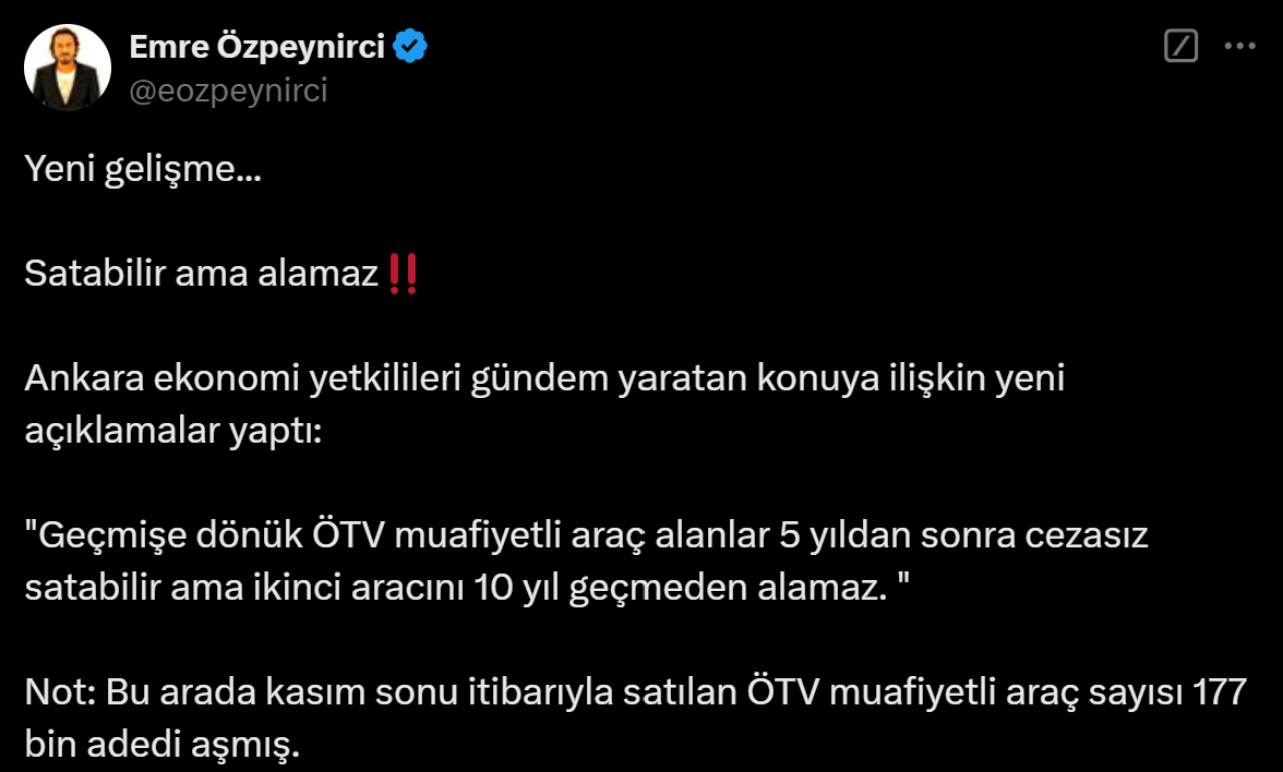 Meclis'ten geçen kanun teklifiyle engellilere yönelik ÖTV muafiyetli araçlarda satış süresi 5 yıldan 10 yıla çıkarılmıştı. Peki, düzenleme eskiden alınan araçlarda geçerli olacak mı? Otomotiv Gazetecisi Emre Özpeynirci yanıtladı... Milyonlarca araç sahibini ilgilendiren ÖTV'siz araç alımına ilişkin değişiklik geçtiğimiz hafta Meclis'ten geçerek yasalaşmıştı. Bu kapsamda engellilere ÖTV'siz araç satışında araç nitelikleri, kullanım yılı gibi önemli kriterlerde değişiklik yapılmıştı. Özel Tüketim Vergisi Kanunu’nda yapılan değişiklikle engelliler araçlarını 5 yıl yerine 10 yılda bir değiştirilebileceği yani aracın 10 yıl boyunca satılamayacağı bildirilmişti. Öte yandan engellilerin alacakları ÖTV'siz araçlarda yüzde 40 yerlilik oranı şartının sağlanması gerektiği aktarılmıştı. Düzenlemenin Resmi Gazete’de yayımlanarak yürürlüğe girmesinin ardından Otomotiv Gazetecisi Emre Özpeynirci de sosyal medya hesabından yeni dönemin detaylarını paylaştı. Özpeynirci’nin konuya ilişkin paylaşımı şöyle oldu: “ÖTV muafiyetli araçlara yönelik yürürlüğe giren düzenleme geçmişi de kapsıyormuş. Yani 5 yıl satamama şartıyla alanlar da ellerindeki aracı yeni düzenlemeye göre 10 yıl satamayacaklar. Yanlış duymadınız, normalde bu tip düzenlemeler geçmişe dönük olmazdı ama yapılan açıklamalar bu işi suistimal edenler nedeniyle düzenlemenin meclisten bu şekilde geçtiği yönünde. Üzgünüm ama durum ne yazık ki bu...” "Satabilir ama alamaz" Bir diğer gönderisinde yeni bilgiler aldığını bildiren Özpeynirci, 5 yıldan sonra araçların cezasız satılabileceğini ancak yeni araç alınamayacağını aktardı. Yani bundan 3 yıl önce araç alan bir kişi 2 yıl sonra aracını satabilecek ancak yeni araç alımı için 7 yıl beklemek zorunda kalacak. Özpeynirci'nin konuya ilişkin son paylaşımı da şöyle oldu: "Yeni gelişme... Satabilir ama alamaz‼️ Ankara ekonomi yetkilileri gündem yaratan konuya ilişkin yeni açıklamalar yaptı: "Geçmişe dönük ÖTV muafiyetli araç alanlar 5 yıldan sonra cezasız satabilir ama ikinci aracını 10 yıl geçmeden alamaz." Kaynak: Emre Özpeynirci - X [news_id:757596]