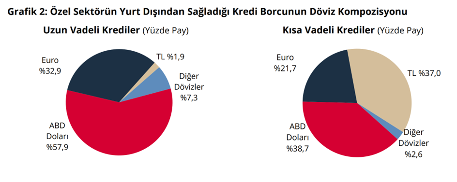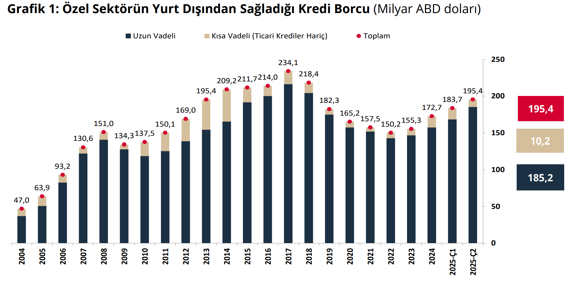 Türkiye Cumhuriyet Merkez Bankası (TCMB) tarafından yayımlanan verilere göre özel sektörün yurt dışından sağladığı toplam kredi borcu bir önceki çeyreğe göre 11,7 milyar dolar artarak 195,4 milyar dolar oldu. Türkiye Cumhuriyet Merkez Bankası (TCMB), Haziran 2025 dönemine ilişkin özel sektörün yurt dışı kredi borcu gelişmelerini yayımladı. Verilere göre haziran sonu itibarıyla, özel sektörün yurt dışından sağladığı toplam kredi borcu, bir önceki çeyreğe göre 11,7 milyar dolar artarak 195,4 milyar dolar oldu. Vadeye göre incelendiğinde, bir önceki çeyreğe göre, uzun vadeli kredi borcunun 16,9 milyar dolar artarak 185,2 milyar dolar, kısa vadeli kredi borcunun (ticari krediler hariç) ise 5,2 milyar dolar azalarak 10,2 milyar dolar düzeyinde gerçekleştiği gözlendi. Kaynak: TCMB Bir önceki çeyreğe göre finansal kuruluşların toplam borcu 4 milyar dolar, finansal olmayan kuruluşların toplam borcu ise 7,7 milyar dolar artış gösterdi. Aynı dönemde finansal kuruluşların uzun vadeli borçları 9,6 milyar dolar, finansal olmayan kuruluşların uzun vadeli borçları 7,3 milyar dolar artış gösterdi. Kısa vadede ise finansal kuruluşların borçları 5,6 milyar dolar azalış ve finansal olmayan kuruluşların borçları 0,4 milyar dolar artış gösterdi. Döviz kompozisyonuna bakıldığında, dolar cinsinden borçlanmanın en yüksek paya sahip olduğu tespit edildi. 185,2 milyar dolar tutarındaki uzun vadeli kredi borcunun %57,9’unun dolar, %32,9’unun euro, %1,9’unun Türk lirası ve %7,3’ünün ise diğer döviz cinslerinden oluştuğu; 10,2 milyar dolar tutarındaki kısa vadeli kredi borcunun ise %38,7’sinin dolar, %21,7’sinin euro, %37,0’ının Türk lirası ve %2,6’sının ise diğer döviz cinslerinden oluştuğu görüldü. Kaynak: TCMB