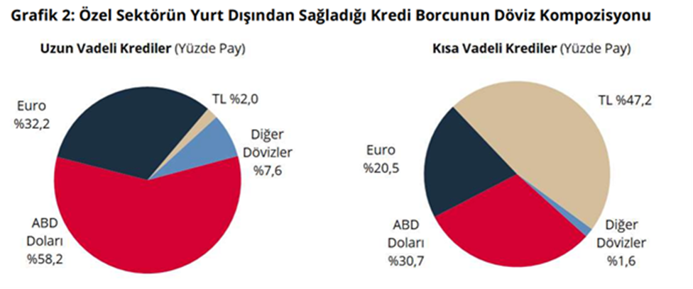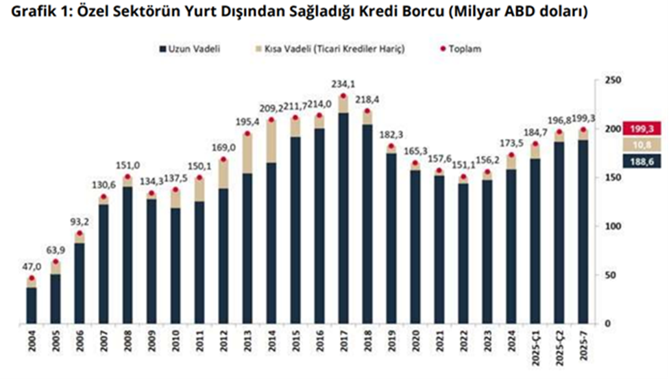 TCMB verilerine göre özel sektörün yurt dışından sağladığı toplam kredi borcu temmuz ayında bir önceki aya göre 2,5 milyar dolar artarak 199,3 milyar dolara yükseldi. Türkiye Cumhuriyet Merkez Bankası (TCMB) Temmuz ayına ilişkin “Özel Sektörün Yurt Dışından Sağladığı Kredi Borcu Gelişmeleri” raporunu yayımladı. Verilere göre özel sektörün yurt dışından sağladığı toplam kredi borcu, bir önceki ay sonuna göre 2,5 milyar dolar artarak 199,3 milyar dolara ulaştı. Vadeye göre incelendiğinde, bir önceki ay sonuna göre, uzun vadeli kredi borcunun 2,1 milyar dolar artarak 188,6 milyar dolar, kısa vadeli kredi borcunun (ticari krediler hariç) ise 0,4 milyar dolar artarak 10,8 milyar dolar düzeyinde gerçekleştiği gözlemlendi. Haziran sonuna göre finansal kuruluşların toplam borcu 3,2 milyar dolar artarken, finansal olmayan kuruluşların toplam borcu ise 0,7 milyar dolar azalış gösterdi. Aynı dönemde finansal kuruluşların uzun vadeli borçları 2,9 milyar dolar artmış, finansal olmayan kuruluşların uzun vadeli borçları 0,8 milyar dolar azaldı. Kısa vadede ise finansal kuruluşların borçları 0,3 milyar dolar, finansal olmayan kuruluşların borçları 0,1 milyar dolar arttı. Döviz kompozisyonuna bakıldığında, dolar cinsinden borçlanmanın en yüksek paya sahip olduğu kaydedildi. 188,6 dolarlık uzun vadeli kredi borcunun yüzde 58,2'sinin dolar, yüzde 32,2'sinin euro, yüzde 2’sinin Türk lirası ve yüzde 7,6'sının ise diğer döviz cinslerinden oluştuğu; 10,8 milyar dolar tutarındaki kısa vadeli kredi borcunun ise yüzde 30,7’sinin dolar, yüzde 20,5’inin euro, yüzde 47,2’sinin Türk lirası ve yüzde 1,6’sının ise diğer döviz cinslerinden oluştuğu görüldü. Özel sektörün yurt dışından sağladığı toplam kredi borcunun 1 yıla kadar olan vade dağılımı incelendiğinde, toplam borç tutarının 55,4 milyar dolar olduğu kaydedildi. Bu tutarın 38,7 milyar dolar bankalara, 15,8 milyar doları finansal olmayan kuruluşlara, 4,9 milyar doları ise bankacılık dışı finansal kuruluşlara ait oldu.