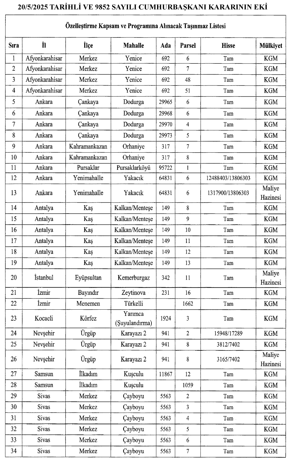 Özelleştirme İdaresi Başkanlığı, mülkiyeti KGM ve Hazine’ye ait 9 farklı ilde 34 taşınmazı satışa çıkardı. Resmi Gazete'de yayımlanan karar ile mülkiyeti Karayolları Genel Müdürlüğü (KGM) ve Maliye Hâzinesi’ne ait 34 adet taşınmaz satışa çıkarıldı. İlgili kararda, özelleştirme işleminin satış yöntemiyle ve varlık satışı suretiyle gerçekleştirileceği, işlemlerin ise 31/12/2028 tarihine kadar tamamlanmasının planlandığı aktarıldı. Özelleştirme geliri nerede kullanılacak? Bu taşınmazların özelleştirilmesi ile elde edilecek gelirin de (mülkiyeti/hissesi Maliye Hâzinesine ait olanlar hariç olmak üzere) giderler düşüldükten sonra; Söz konusu taşınmazlar üzerindeki tesislerin taşınması ile ihtiyaç duyulan yeni yapıların inşası ve mevcut yapıların bakım, onarım ve güçlendirilmesinde, 6/2/2023 tarihinde meydana gelen depremden etkilenen illeri kapsayan afet bölgesindeki ve deprem riski taşıyan diğer illerdeki KGM’ye ait her türlü yapı ve tesislerin bakım, onarım, güçlendirme ve yeniden inşasında, Bölünmüş yol veya Devlet ve il yollarının yapım, bakım ve kamulaştırma hizmetlerinde kullanılmak üzere, KGM hesabına aktarılmasına karar verildi. Özelleştirme kapsamına alınacak taşınmazlar ise şöyle listelendi: Kaynak: Resmi Gazete [news_id:751464]