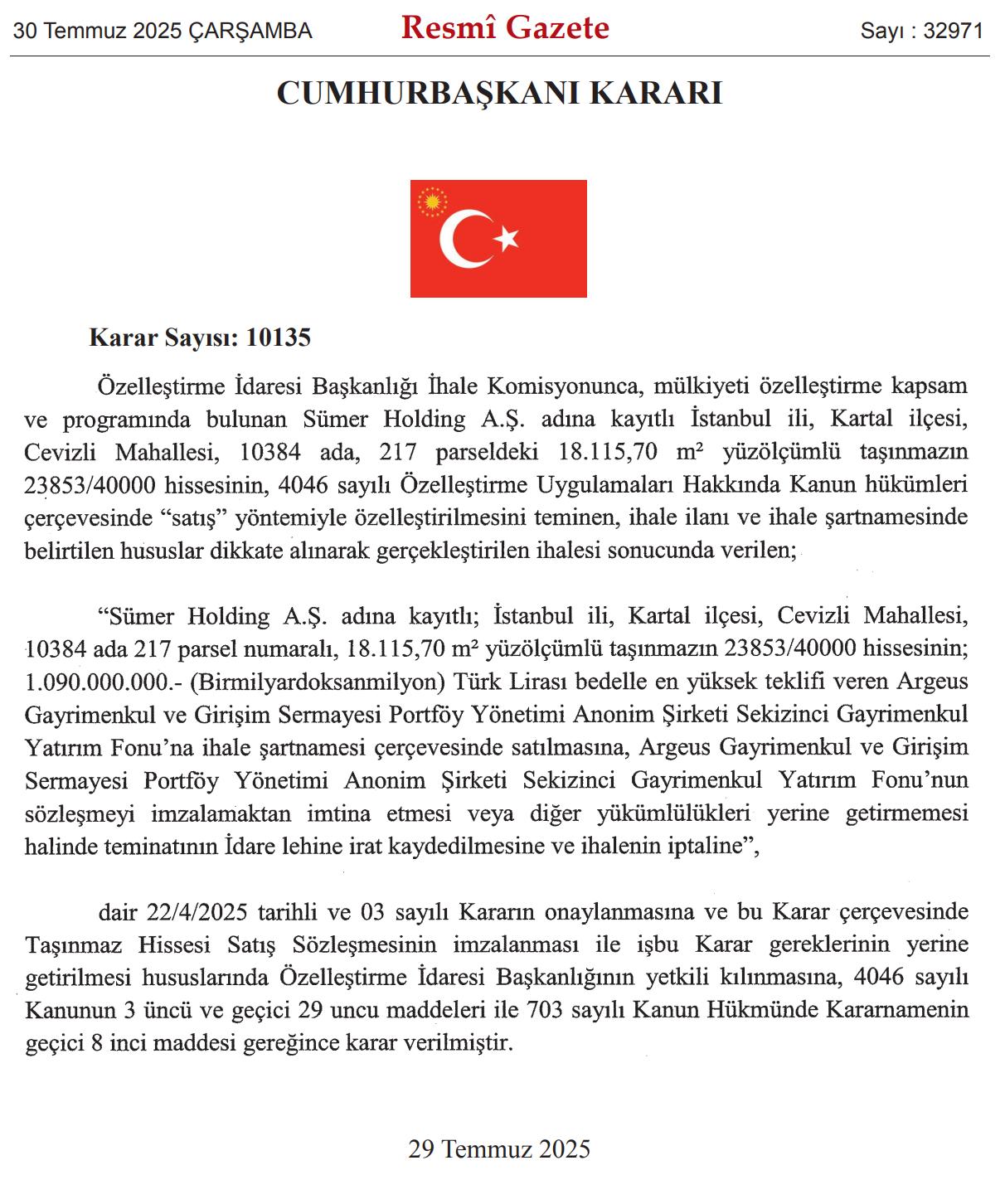 Özelleştirme İdaresi Başkanlığının (ÖİB), İstanbul'un Kartal ilçesindeki bir taşınmazın satışına ilişkin kararına onay verildi. Konuya ilişkin Cumhurbaşkanı Kararı, Resmi Gazete'de yayımlandı. Buna göre, özelleştirme kapsam ve programında bulunan, Sümer Holding AŞ adına kayıtlı, İstanbul'un Kartal ilçesi Cevizli Mahallesi'ndeki taşınmazın, ihalede 1 milyar 90 milyon lira bedelle en yüksek teklifi veren Argeus Gayrimenkul ve Girişim Sermayesi Portföy Yönetimi AŞ. Sekizinci Gayrimenkul Yatırım Fonu'na satışı kararı onaylandı.