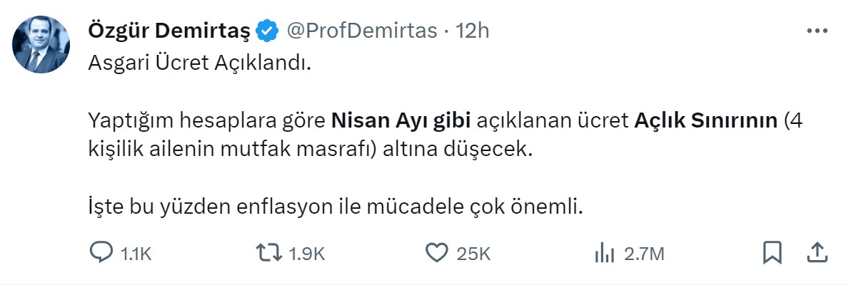 Ekonomist Prof. Dr. Özgür Demirtaş, 2024 yılı için açıklanan asgari ücretin nisan ayında 4 kişilik ailenin en düşük aylık masrafı olan açlık sınırının altına düşeceğini öne sürdü. Özgür Demirtaş, X platformandan asgari ücret artışını değerlendirdi. Buna göre Demirtaş, enflasyonla mücadelenin çok önemli olduğunun altını çizerek şu ifadeleri kullandı: "Asgari ücret açıklandı. Yaptığım hesaplara göre nisan ayı gibi açıklanan ücret, açlık sınırının (4 kişilik ailenin mutfak masrafı) altına düşecek. İşte bu yüzden enflasyon ile mücadele çok önemli." Kaynak: Özgür Demirtaş - X [news_id:719184]