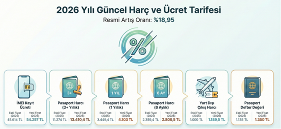 Yeni yılda vergi ve harçların yüzde 18,95 oranında artırılacağının açıklanmasıyla pasaport ve ehliyet harçlarıyla IMEI kayıt ücretlerinde 2026 tarifesi netlik kazandı. Cumhurbaşkanı Kararı ile yeni yılda uygulanacak vergi ve harçların yeniden değerleme oranı olan yüzde 25,49 yerine yüzde 18,95 artırılmasına karar verildi. Resmi Gazete’de yayımlanan karara göre, yurt dışından akıllı telefon alanların, yurt içinde cihazlarını kullanabilmek için ödemesi gereken kayıt ücreti (IMEI kayıt ücreti) 2026 yılı için 54 bin 257 lira oldu. Eğer Yeniden Değerleme Oranı 18,95 yerine yüzde 25,49 olarak uygulansaydı bu bedel 57 bin 240 TL olacaktı. Yeni zam oranının ardından yurt dışı çıkış harcı ücreti de 1000 TL'den 1.189,5 TL'ye yükseldi. Otomobil, minibüs, kamyonet sürücüleri için kullanılan B sınıfı sürücü belgesi harcı 5.678 TL’den 6.754 TL’ye, A sınıfı sürücü belgesi harcı da 1.883 TL’den 2.240 TL’ye çıktı. Yeni yılda 6 aylık pasaport harcı bedeli 2.806 TL’ye çıkarken, 3 yıldan uzun süreli harç bedeli 13.410 TL’ye yükseldi. [news_id:797105] [news_id:797116]