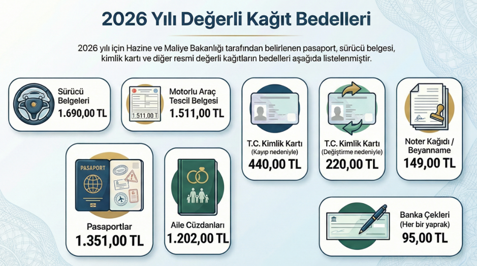 Pasaport, ehliyet ve kimlik kartları gibi değerli kağıtların 2026 yılında uygulanacak satış bedelleri belirlendi. Hazine ve Maliye Bakanlığı Muhasebat Genel Müdürlüğü, 2026 yılında uygulanacak değerli kâğıt bedellerini belirleyen genel tebliğini Resmî Gazete'de yayımladı. Tebliğe göre, 210 sayılı Değerli Kâğıtlar Kanunu kapsamındaki birçok belgenin bedeli 2026 yılı için ortalama yüzde 19,01 oranında artırıldı. Böylece artış oranı, yüzde 25,49 olarak belirlenen yeniden değerleme oranının altında tutulmuş oldu. Pasaport, ehliyet ve araç tescil ücretleri arttı En çok kullanılan belgeler arasında yer alan pasaport cüzdan bedeli 2025’te 1.135 TL iken, 2026 için 1.351 TL olarak belirlendi. Ehliyet (sürücü belgesi) bedeli ise 1.420 TL’den 1.690 TL’ye yükseltildi. Motorlu araçlar tescil belgesi ücreti 1.270 TL’den 1.511 TL’ye çıkarılırken, aile cüzdanı bedeli 1.010 TL’den 1.202 TL’ye yükseldi. Kimlik kartlarında 'kayıp' ayrımı Türkiye Cumhuriyeti Kimlik Kartları için ücretlendirme, düzenlenme nedenine göre farklılaştırıldı. Kanuni bildirim süresi dışında doğum veya değiştirme nedeniyle düzenlenen kimlik kartları 220 TL, kayıp nedeniyle yeniden düzenlenen kimlik kartları 440 TL olarak belirlendi. Noter ve ticari işlemler Noter kâğıdı ve beyannameler için bedel 149 TL, protesto, vekâletname ve resen senetler için ise 298 TL olarak belirlendi. Banka çeklerinin her bir yaprağı için alınacak bedel 95 TL oldu. Yabancı çalışma izin belgesi ücreti ise 810 TL’den 964 TL’ye çıkarıldı. Yurt dışı tahsilatlar ve eski tebliğ Tebliğde ayrıca, yurt dışı temsilcilikler tarafından satılan değerli kâğıtların bedellerinin yabancı para cinsinden tahsilinde, Türkiye Cumhuriyet Merkez Bankası’nın 2025 yılının son iş günü saat 15.30’da belirlediği efektif alış kurlarının esas alınacağı belirtildi. Bu düzenleme ile birlikte, 31 Aralık 2024 tarihli ve 32769 sayılı Resmi Gazete’de yayımlanan önceki tebliğ yürürlükten kaldırılmış oldu. [news_id:796305]