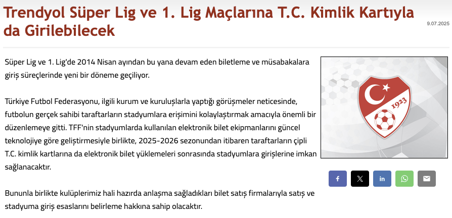 Türkiye Futbol Federasyonu, stadyumlara giriş sürecine dair önemli bir düzenlemeyi kamuoyuna duyurdu. 09 Temmuz 2025 tarihinde yapılan açıklamada, “Süper Lig ve 1. Lig'de 2014 Nisan ayından bu yana devam eden biletleme ve müsabakalara giriş süreçlerinde yeni bir döneme geçiliyor.” ifadelerine yer verilerek, bugüne dek sürdürülen Passolig sistemine son verildiği bildirildi. TFF, taraftarların stadyumlara erişimini kolaylaştırmak amacıyla ilgili kurum ve kuruluşlarla yaptığı görüşmeler sonucunda yeni bir uygulamayı hayata geçirdi. Yapılan teknik altyapı çalışmalarıyla birlikte, stadyumlarda kullanılan elektronik bilet ekipmanlarının güncel teknolojiye göre yeniden düzenlendiği ve bu sayede çipli T.C. kimlik kartlarına elektronik bilet yüklenebilmesinin mümkün hale geldiği belirtildi. Bu sistemin uygulanacağı 2025-2026 sezonundan itibaren, taraftarlar kimlik kartlarını elektronik bilete dönüştürerek stadyumlara giriş yapabilecek. Kulüplere Bilet Satışında Esneklik Tanındı Federasyonun açıklamasında yer alan bir diğer önemli başlık, bilet satışı ve giriş uygulamaları konusunda kulüplerin sahip olduğu yetkiyle ilgili oldu. Açıklamada, “TFF'nin stadyumlarda kullanılan elektronik bilet ekipmanlarını güncel teknolojiye göre geliştirmesiyle birlikte, 2025-2026 sezonundan itibaren taraftarların çipli T.C. kimlik kartlarına da elektronik bilet yüklemeleri sonrasında stadyumlara girişlerine imkan sağlanacaktır. Kulüplerimiz hali hazırda anlaşma sağladıkları bilet satış firmalarıyla satış ve stadyuma giriş esaslarını belirleme hakkına sahip olacaktır.” denildi. Bu kapsamda, her kulüp kendi tercihi doğrultusunda farklı biletleme firmalarıyla çalışabilecek ve satış süreçlerine dair karar alma inisiyatifini elinde bulunduracak. Passolig’in zorunlu olmadığı yeni sistemde, çipli kimlik kartlarının sunduğu dijital altyapı ile taraftarların maç günlerinde daha hızlı ve pratik şekilde stadyumlara ulaşması hedeflendi. Yeni sistemin detayları ilerleyen günlerde kulüpler ve taraftarlar nezdinde daha geniş biçimde duyurulacak.