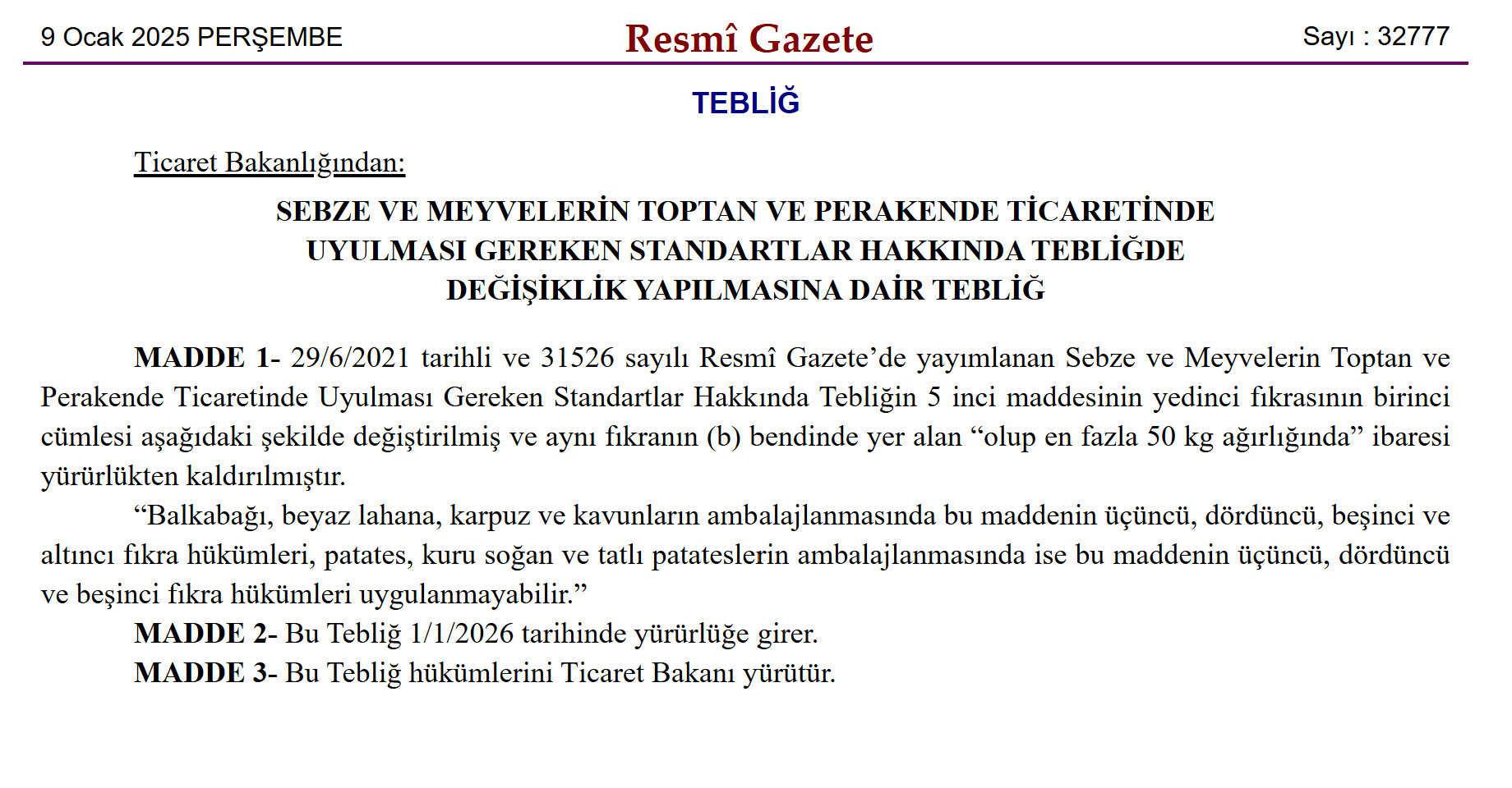 Patates, kuru soğan ve tatlı patateslerin ambalajlama standartlarında değişiklik yapıldı. Ticaret Bakanlığınca hazırlanan "Sebze ve Meyvelerin Toptan ve Perakende Ticaretinde Uyulması Gereken Standartlar Hakkında Tebliğ'de Değişiklik Yapılmasına Dair Tebliğ" Resmi Gazete'de yayımlandı. Bu kapsamda toptan ve perakende ticarette patates, kuru soğan ve tatlı patates için file, jüt çuval, torba, kasa veya kutu şeklindeki ambalajlar en fazla 30 kilogram olabilecek. Bu ürünlerin ambalajları daha önce en fazla 50 kilogram olabiliyordu. Tebliğ, 1 Ocak 2026'da yürürlüğe girecek. Kaynak: Resmi Gazete