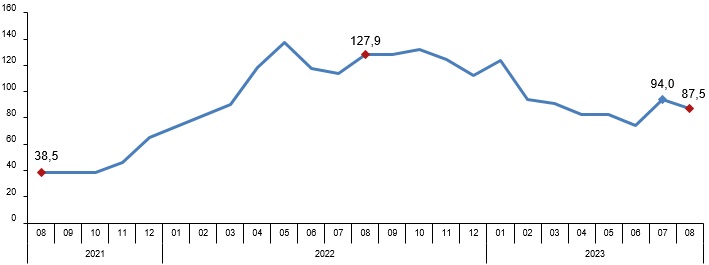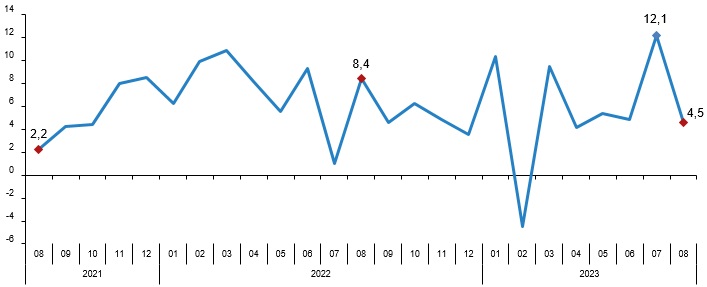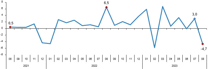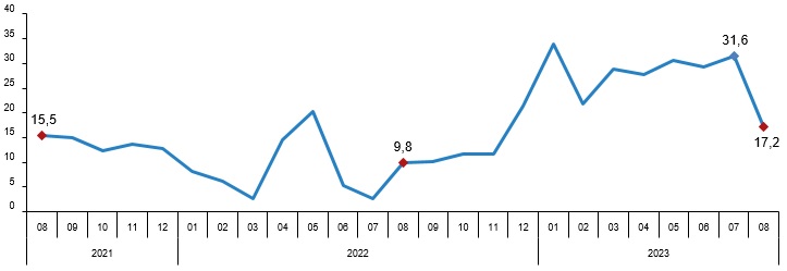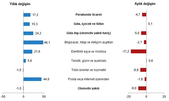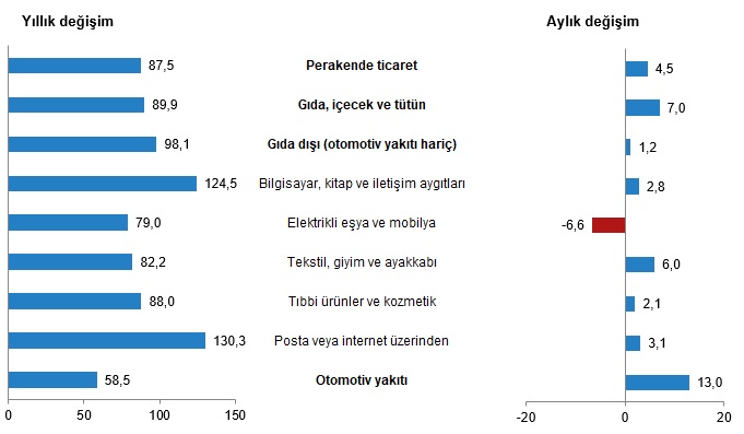 TÜİK verilerine göre perakende satış hacmi ağustosta aylık yüzde 4,7 düşerken, yıllık bazda ise yüzde 17,2 artış kaydetti. Türkiye İstatistik Kurumu (TÜİK) tarafından yapılan açıklamaya göre, sabit fiyatlarla perakende satış hacmi (2015=100) 2023 yılı Ağustos ayında bir önceki yılın aynı ayına göre %17,2 arttı. Aynı ayda gıda, içecek ve tütün satışları %15,3, gıda dışı satışlar (otomotiv yakıtı hariç) %24,2 arttı, otomotiv yakıtı satışları ise %1,0 azaldı. Perakende satış hacmi yıllık değişim oranı (%), Ağustos 2023 Perakende satış hacmi aylık %4,7 azaldı Sabit fiyatlarla perakende satış hacmi (2015=100) 2023 yılı Ağustos ayında bir önceki aya göre %4,7 azaldı. Aynı ayda gıda, içecek ve tütün satışları %0,1 arttı, gıda dışı satışlar (otomotiv yakıtı hariç) %5,6, otomotiv yakıtı satışları ise %9,0 azaldı. Perakende satış hacmi sektörlere göre yıllık ve aylık değişim oranları (%), Ağustos 2023 Perakende ciro yıllık %87,5 arttı Cari fiyatlarla perakende ciro (2015=100) 2023 yılı Ağustos ayında bir önceki yılın aynı ayına göre %87,5 arttı. Aynı ayda gıda, içecek ve tütün satışları %89,9, gıda dışı satışlar (otomotiv yakıtı hariç) %98,1, otomotiv yakıtı satışları ise %58,5 arttı. Perakende ciro yıllık değişim oranı (%), Ağustos 2023 Perakende ciro aylık %4,5 arttı Cari fiyatlarla perakende ciro (2015=100) 2023 yılı Ağustos ayında bir önceki aya göre %4,5 arttı. Aynı ayda gıda, içecek ve tütün satışları %7,0, gıda dışı satışlar (otomotiv yakıtı hariç) %1,2, otomotiv yakıtı satışları ise %13,0 arttı. Perakende ciro aylık değişim oranı (%), Ağustos 2023 Perakende ciro sektörlere göre yıllık ve aylık değişim oranları (%), Ağustos 2023 Bu konu ile ilgili bir sonraki haber bülteninin yayımlanma tarihi 13 Kasım 2023'tür.