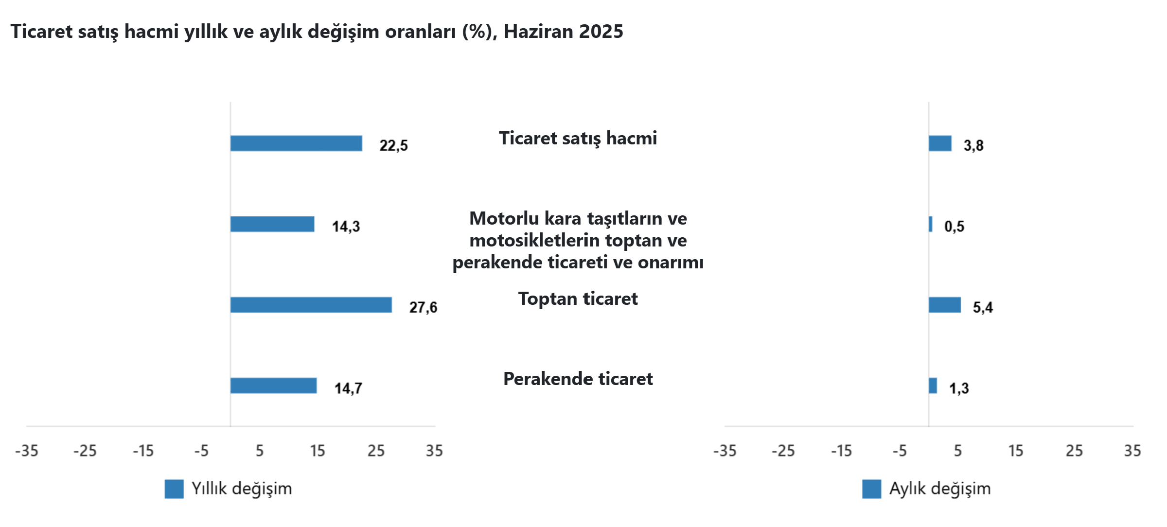 Mayıs ayında yıllık bazda yüzde 17,7 artarak 14 ayın zirvesine çıkan perakende satış hacmi, haziranda yüzde 14,7 artış gösterdi. Türkiye İstatistik Kurumu (TÜİK), haziran ayına ilişkin ticaret satış hacmi endeksini açıkladı. Buna göre, ticaret satış hacmi, haziranda bir önceki aya kıyasla yüzde 3,8 arttı. Bu dönemde motorlu kara taşıtları ve motosikletlerin toptan ve perakende ticareti ile onarımı için satış hacmi yüzde 0,5, toptan ticaret satış hacmi yüzde 5,4 ve perakende ticaret satış hacmi yüzde 1,3 yükseldi. Ticaret satış hacmi, haziranda geçen yılın aynı ayına göre yüzde 22,5 artış kaydetti. Aynı dönemde motorlu kara taşıtlarının ve motosikletlerin toptan ve perakende ticareti ile onarımı için satış hacmi yüzde 14,3, toptan ticaret satış hacmi yüzde 27,6 ve perakende ticaret satış hacmi yüzde 14,7 artış gösterdi. Kaynak: TÜİK