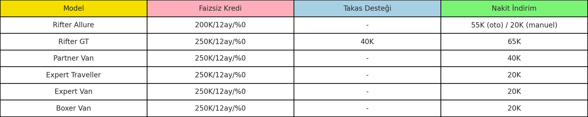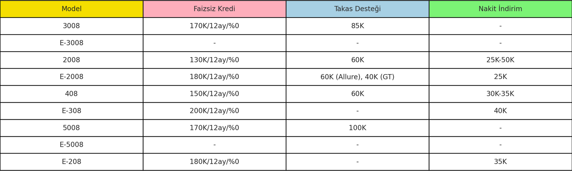 Peugeot Türkiye, Nisan 2025 boyunca geçerli olacak kampanyası kapsamında binek ve hafif ticari araç modellerinde çeşitli faizsiz kredi, takas desteği ve nakit indirim fırsatları sunmaya başladı. SUV modellerinden elektrikli seçeneklere kadar genişleyen kampanya, model ve donanım seviyelerine göre farklı avantajlar içerdi. Peugeot Türkiye’nin Nisan ayına özel olarak başlattığı kampanyada SUV 3008, yeni SUV 5008, E-208, E-308 ve 408 gibi modellerde, donanım seviyelerine göre şekillenen kredi ve nakit indirim imkanları yer aldı. Yapılan açıklamada, "Peugeot Türkiye, SUV 3008, yeni SUV 5008, E-208, E-308 ve 408 modellerinde, donanım seviyelerine göre farklı kredi ve nakit indirim seçeneklerini müşterilere sunuyor" ifadeleri kullanıldı. Yeni 3008 modeli, tüzel müşterilere özel olmak üzere 85.000 TL takas desteği ile birlikte, 270.000 TL’ye 12 ay vadeli %1,99 faizli kredi veya 170.000 TL’ye 12 ay vadeli %0 faizli kredi seçenekleri ile satışa sunuldu. Bu modelin yüzde 100 elektrikli versiyonu olan E-3008 ise bireysel müşterilere Allure donanım seviyesinde ve tüzel müşterilere GT donanım seviyesinde, 300.000 TL için 12 ay vadeli %2,89 faizli kredi imkanıyla satışa çıktı. Peugeot 2008 modelinde 60.000 TL takas desteği ile birlikte, 250.000 TL’ye 12 ay vadeli %1,99 faizli kredi ya da 130.000 TL’ye 12 ay vadeli %0 faizli kredi seçenekleri sunuldu. Bunun yanında GT donanım seviyesinde 50.000 TL, Allure donanım seviyesinde ise 25.000 TL nakit indirim uygulandı. Modelin yüzde 100 elektrikli versiyonu olan E-2008 Allure donanım seviyesinde 60.000 TL takas desteğiyle birlikte 180.000 TL’ye 12 ay vadeli %0 faizli kredi veya 25.000 TL nakit indirimle sunulurken, GT donanımlı versiyonu da 40.000 TL takas desteğiyle beraber 200.000 TL’ye 12 ay vadeli %0 faizli kredi veya 25.000 TL nakit indirim fırsatlarıyla tüketicilere sunuldu. Kompakt segmentte yer alan Peugeot 408 modeli, Nisan ayı süresince Allure donanım seviyesinde 60.000 TL takas desteğiyle birlikte 150.000 TL için 12 ay vadeli %0 faizli kredi veya 35.000 TL nakit indirim seçeneğiyle satışa çıkarıldı. GT donanım seviyesinde ise 30.000 TL nakit indirimi ya da tüzel müşterilere özel olarak 150.000 TL için 12 ay vadeli %0 faizli kredi imkanı sağlandı. Peugeot’nun C segmentindeki yüzde 100 elektrikli hatchback modeli E-308 için, 40.000 TL nakit indirimi ya da 250.000 TL’ye kadar 12 ay vadeli %0,99 faizli kredi seçeneği sunulurken, aynı model ayrıca 200.000 TL’ye 12 ay vadeli %0 faizli kredi alternatifi ile de Nisan ayında tüketiciyle buluşturuldu. SUV sınıfındaki 7 koltuklu ve 48V hibrit motor teknolojisiyle donatılan yeni Peugeot 5008 modelinde 100.000 TL takas indirimi uygulanırken, tüzel müşterilere özel olarak 270.000 TL için 12 ay vadeli %1,99 faizli kredi veya 170.000 TL için 12 ay vadeli %0 faizli kredi imkanı tanındı. Modelin yüzde 100 elektrikli versiyonu olan E-5008 ise sadece tüzel müşterilere özel olarak GT donanım seviyesinde, 300.000 TL için 12 ay vadeli %2,89 faizli kredi seçeneği ile sunuldu. Yüzde 100 elektrikli E-208 modelinde ise 230.000 TL için 12 ay vadeli %0,99 faizli kredi ya da 180.000 TL için 12 ay vadeli %0 faizli kredi seçenekleri yer aldı. Kredi kullanmak istemeyen müşteriler için ise E-208 modelinde 35.000 TL nakit indirim fırsatı sağlandı. Hafif ticari araçlarda faizsiz kredi ve indirim seçenekleri Peugeot Türkiye’nin Nisan ayı kampanyası kapsamında hafif ticari araçlarda da sıfır faizli kredi ve çeşitli nakit indirim fırsatları dikkat çekti. Peugeot Rifter modelinin Allure donanım seviyesinde 200.000 TL için 12 ay vadeli %0 faizli kredi imkanı sunulurken, GT donanım seviyesinde 40.000 TL takas desteği ile birlikte 250.000 TL’ye 12 ay vadeli %0 faizli kredi seçeneği yer aldı. Rifter GT donanımında kredi kullanmak istemeyen müşterilere 65.000 TL, otomatik şanzımanlı Allure donanımda 55.000 TL, manuel şanzımanlı Allure donanımda ise 20.000 TL nakit indirim sağlandı. Partner Van modelinde 40.000 TL nakit indiriminin yanı sıra 250.000 TL’ye kadar 12 ay vadeli %0 faizli kredi veya 500.000 TL için 12 ay vadeli %2,39 faizli kredi alternatifi sunuldu. Expert Traveller, Expert Van ve Boxer Van 3,5 ton modellerinde geçerli olmak üzere 250.000 TL için 12 ay vadeli %0 faizli kredi ya da 500.000 TL’ye 12 ay vadeli %2,39 faizli kredi seçeneklerinin yanı sıra, 20.000 TL’ye varan nakit indirim imkanları da müşterilere sunuldu.
