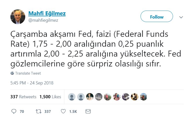 Fed'in faiz toplantısı Çarşamba günü gerçekleşecek. Son faiz toplantısından bu yana ülkede istihdam ve büyüme ivmesi güçlü kalırken ücretler ve enflasyon da arttı. Fed'in bu hafta faiz artırmasına neredeyse kesin gözüyle bakılıyor, piyasa faiz artışından daha çok Aralık ve 2019'a yönelik açıklamalara odaklanacak. Piyasalar 25 baz puanlık faiz artışını hali hazırda fiyatlamış durumda, ancak Aralık ayında faiz artışı olup olmayacağına dair sinyaller ve yeni ekonomik projeksiyonlar takip edilecek. Ekonomist Mahfi Eğilmez Twitter hesabı üzerinden yaptığı paylaşımda, “Çarşamba akşamı Fed, faizi (Federal Funds Rate) 1,75 - 2,00 aralığından 0,25 puanlık artırımla 2,00 - 2,25 aralığına yükseltecek. Fed gözlemcilerine göre sürpriz olasılığı sıfır.” sözlerine yer verdi.