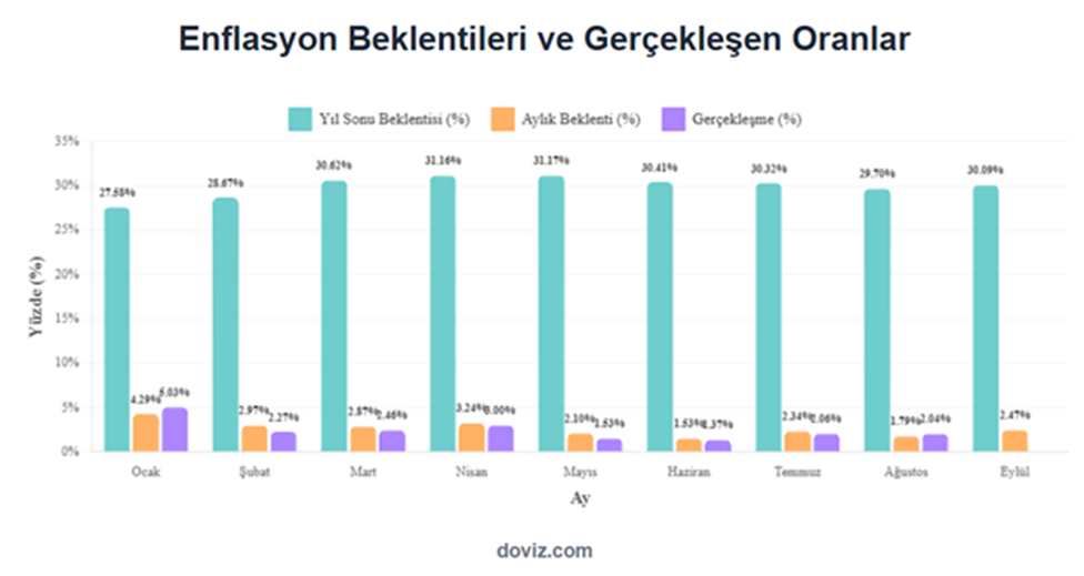 AA Finans Enflasyon Beklenti Anketi'ne katılan ekonomistler, eylülde Tüketici Fiyat Endeksi'nin (TÜFE) aylık bazda yüzde 2,47 artacağını tahmin ediyor. AA Finans'ın Türkiye İstatistik Kurumu (TÜİK) tarafından 3 Ekim Cuma günü açıklanacak eylül ayı enflasyon verilerine ilişkin beklenti anketi, 26 ekonomistin katılımıyla sonuçlandı. Ankete katılan ekonomistlerin eylülde aylık enflasyon beklentilerinin ortalaması yüzde 2,47 oldu. Ekonomistlerin eylül ayı için enflasyon beklentileri yüzde 1,95 ile yüzde 2,70 aralığında yer aldı. Ekonomistlerin eylül ayı enflasyon beklentilerinin ortalamasına göre (yüzde 2,47) bir önceki ay yüzde 32,95 olan yıllık enflasyonun eylülde yüzde 32,31'e ineceği öngörülüyor. Öte yandan, ekonomistlerin 2025 sonu enflasyon beklentisi eylül ayı itibarıyla yüzde 30,09 oldu. Ekonomistlerin yıl sonu için enflasyon beklentileri yüzde 29,20 ile yüzde 32,54 aralığında yer aldı. Tüketici Fiyat Endeksi, ağustosta yüzde 2,04 artış kaydetmişti. 2025 yılı aylar itibarıyla ekonomistlerin enflasyon beklentileri ve gerçekleşmeler şöyle: [news_id:786313]