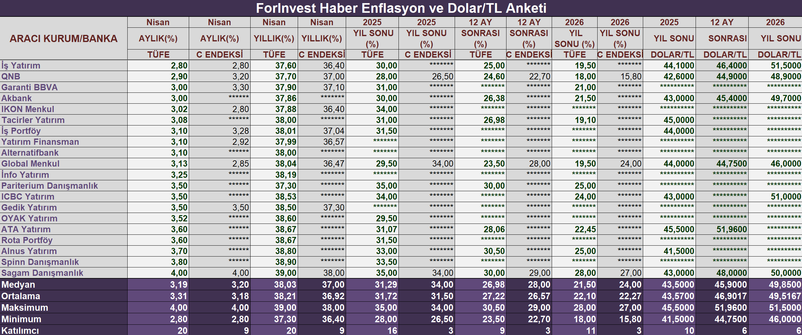 Ekonomistlerin nisan ayı enflasyonuna ilişkin beklentisi iki yeni anketle belirlendi. TÜİK, nisan ayına yönelik resmi enflasyon verilerini 5 Mayıs 2025 Pazartesi günü saat 10.00'da açıklayacak. Açıklanacak veri öncesinde ForInvest Haber ve AA Finans veriye ilişkin beklenti anketi hazırladı. 20 ekonomistin katılım sağladığı ForInvest Haber anketinde nisan ayı yıllık TÜFE verisi için medyan tahmin yüzde 38,03, ortalama tahmin ise yüzde 38,21 artışa işaret etti. Ekonomistlerin nisan ayı Tüketici Fiyat Endeksi'nde (TÜFE) aylık medyan tahmin yüzde 3,19, ortalama tahmin ise yüzde 3,31 artış yönünde gerçekleşti. TÜFE'de aylık en yüksek ve en düşük artış beklentileri sırasıyla yüzde 4,00 ve yüzde 2,80 şeklinde oluşurken, yıllık tahminler ise yüzde 39,00 ila yüzde 37,30 bandında oluştu. Kaynak: ForInvest Haber AA Finans anketine katılan 17 kurumun nisan ayı enflasyon beklentilerinin ortalaması ise yüzde 3,24 oldu. Ekonomistlerin nisan ayı için enflasyon beklentileri yüzde 2,75 ile yüzde 3,80 aralığında yer aldı. Ekonomistlerin nisan ayı enflasyon beklentilerinin ortalamasına göre (yüzde 3,24), bir önceki ay yüzde 38,10 olan yıllık enflasyonun yüzde 38,18'e çıkacağı hesaplandı. Öte yandan ekonomistlerin 2025 sonu enflasyon beklentisi nisan ayı itibarıyla yüzde 31,16 oldu. Tüketici Fiyat Endeksi son olarak mart ayında yüzde 2,46 artış kaydetmişti. [news_id:770664] [news_id:770712]