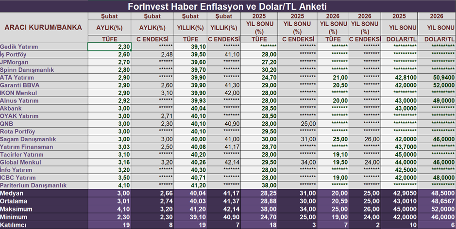 Ekonomistlerin şubat ayı enflasyonuna ilişkin beklentisi iki yeni anketle belirlendi. Türkiye’de enflasyon 2025 yılının ilk ayında aylık bazda yüzde 5,03, yıllık bazda ise yüzde 42,12 artış kaydetmişti. Beklentileri aşan ocak enflasyonunun ardından şubat ayına ilişkin resmi enflasyon verileri ise 3 Mart 2025 Pazartesi günü saat 10.00'da belli olacak. ForInvest Haber ve Bloomberg HT ise açıklanacak veri öncesinde beklenti anketi hazırladı. 19 ekonomistin katılım sağladığı ForInvest Haber anketinde şubat ayı yıllık TÜFE verisi için medyan tahmin yüzde 40,04, ortalama tahmin ise yüzde 40,03 artışa işaret etti. TÜFE'de aylık en yüksek ve en düşük artış beklentileri sırasıyla yüzde 4,10 ve yüzde 2,30 şeklinde oluşurken, yıllık tahminler ise yüzde 41,20 ila yüzde 39,10 bandında oluştu. Kaynak: ForInvest Haber Bloomberg HT'nin enflasyon anketine katılan 21 kurumun medyan tahmini de şubat enflasyonunun aylık yüzde 3, yıllık yüzde 39,97 olarak açıklanması yönünde oldu. Şubat enflasyonu için en düşük aylık beklenti yüzde 2,30 olurken en yüksek beklenti yüzde 4,10 olarak kaydedildi. Ekonomistler ise elektrik tüketiminde kademeli fiyat tarifesine geçilmesi, SGK katkı paylarında kısmi düşüş ve gıda fiyatlarındaki oynaklık sebebiyle bu ay belirsizliğin yüksek olduğunu belirterek, mart ayındaki enflasyon verilerinin ana eğilim açısından daha net bir tablo sunacağını söyledi. [news_id:763606]