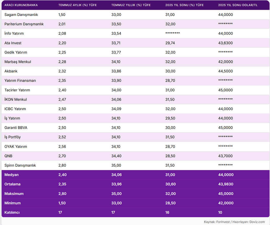 Temmuz ayı enflasyonuna yönelik 17 ekonomistin katılım sağladığı beklenti anketi sonuçlandı. İşte ankete katılan ekonomistlerin temmuz enflasyonuna yönelik son tahminleri.. TÜİK, temmuz ayına yönelik resmi enflasyon verilerini 4 Ağustos 2025 Pazartesi günü saat 10.00'da açıklayacak. Açıklanacak veri öncesinde ForInvest Haber beklenti anketi hazırladı. 17 ekonomistin katılım sağladığı ForInvest Haber anketinde temmuz ayı yıllık TÜFE verisi için medyan tahmin yüzde 34,06, ortalama tahmin ise yüzde 33,96 artışa işaret etti. Ekonomistlerin temmuz ayı Tüketici Fiyat Endeksi'nde (TÜFE) aylık medyan tahmini yüzde 2,40, ortalama tahmini ise yüzde 2,35 artış yönünde gerçekleşti. TÜFE'de aylık en yüksek ve en düşük artış beklentileri sırasıyla yüzde 2,80 ve yüzde 1,50 şeklinde oluşurken, yıllık tahminler ise yüzde 35,00 ila yüzde 33,00 bandında oluştu. İlgili ankette 2025 sonunda Tüketici Fiyat Endeksi'nin yüzde 31,00 seviyesinde gerçekleşeceği tahmin edildi. Yıl sonu enflasyonu için maksimum tahmin yüzde 32,00, minimum tahmin ise yüzde 28,50 artış yönünde oldu. Memur ve emeklinin zammını belirleyen son veri olan haziran enflasyonu ise yıllık bazda yüzde 35,05, aylık bazda yüzde 1,37 seviyesinde ölçülmüştü. Kaynak: ForInvest Haber Yıl sonu dolar beklentisi 44 lira Aynı ankette ekonomistlerin yıl sonu dolar kuruna ilişkin beklentilerine de yer verildi. 10 analistin katılım sağladığı anketin sonuçlarına göre dolar/TL’de 2025 sonuna ilişkin tahminlerin ortalaması 44,0000 seviyesine işaret etti. Önceki anket döneminde medyan tahmin 43,6800 olmuştu. 12 ay sonrasına ilişkin dolar/TL tahmini 48,2900 seviyesinde gerçekleşirken, bir önceki anket döneminde 50,0000 olan 2026 yıl sonu dolar kuru tahmini ise 51,7750 oldu. [news_id:779099]