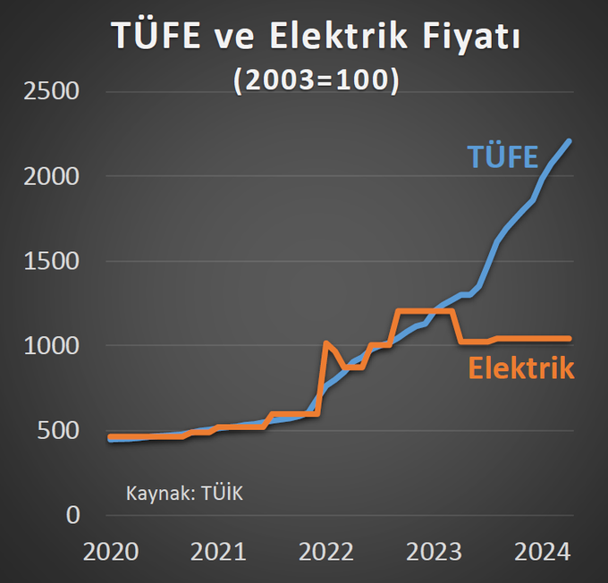 Nisan ayı enflasyon rakamlarının ardından ekonomistlerden de dikkat çeken tespitler gelmeye devam ediyor. Buna göre son olarak Prof. Dr. Hakan Kara, TÜFE ile elektrik fiyatı kıyaslamasını paylaşarak, “Elektriğe ciddi zam kapıda” dedi. Bilkent Üniversitesi Ekonomi Bölümü’nde görev yapan Prof. Dr. Hakan Kara, X hesabından tüketici fiyatları enflasyonu (TÜFE) ile elektrik fiyatları arasındaki ilişkiyi ortaya koyan bir grafik paylaştı. Eski Merkez Bankası Başekonomisti Prof. Dr. Kara’nın paylaştığı grafiğe göre elektrik fiyatları yatay seyrederken, TÜFE’de sert bir yükseliş yaşandı. Kaynak: Hakan Kara - X Bu grafiği, “Elektriğe ciddi zam kapıda. Muhtemelen Temmuz-Ağustos'ta yapılır.” notuyla paylaşan Kara, grafiğin %100'ün üzeri bir zamma işaret ettiğini fakat muhtemelen artışın bu seviyenin altında kalacağını da belirtti. Türkiye İstatistik Kurumu (TÜİK) ise bugün nisan ayı enflasyon rakamlarını açıklamıştı. TÜİK’in hesabına göre nisanda aylık enflasyon yüzde 3,18, yıllık enflasyon ise yüzde 69,80 olarak tespit edilmişti. Türkiye Cumhuriyet Merkez Bankası’nın (TCMB) 2024 için yıl sonu enflasyon tahmini ise yüzde 36 olarak belirlenirken, Merkez’in tahmin aralıklarında üst bant yüzde 42 olarak tespit edilmişti. [news_id:723633] Elektrik fiyatları nasıl belirleniyor? Elektrik fiyatları, EPDK'nin (Enerji Piyasası Düzenleme Kurumu) yılda dört kez 'maliyet değişimlerine göre' belirlenip her tarife dönemi başında açıklanıyor. Elektrik maliyet belirlemelerinde (elektrik birim fiyatların berlenmesi); enerji üretim maliyetleri, dağıtım, vergiler, yatırım, enflasyon gibi etkenler belirleyici oluyor. 1 Ocak, 1 Nisan, 1 Temmuz ve 1 Ekim (her tarife dönemi, üçer aylık dönemlerden oluşuyor). Her tarife döneminin birim elektrik fiyatları, bir önceki ayın son günü belirlenip kamuoyuna açıklanıyor. [news_id:732132]