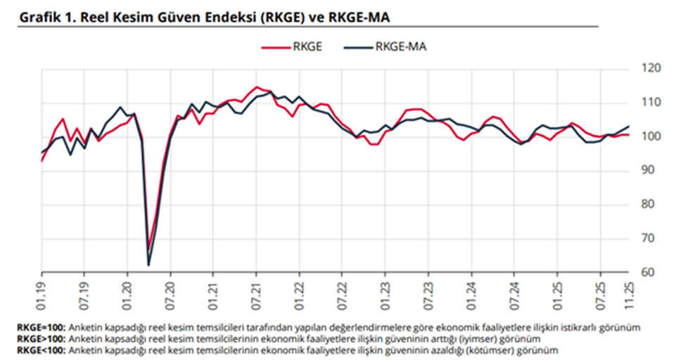 Mevsimsellikten arındırılmış reel kesim güven endeksi kasımda bir önceki aya göre 1,2 puan artarak 103,2'ye yükseldi. Türkiye Cumhuriyet Merkez Bankası (TCMB), kasım ayı reel kesim güven endeksi verilerini açıkladı. Mevsimsellikten arındırılmış reel kesim güven endeksi bir önceki aya göre 1,2 puan artarak 103,2'ye yükseldi. Önceki ay reel kesim güven endeksi 102 seviyesindeydi. Reel kesim güveni böylece mart ayında gördüğü 103,2 seviyesine yeniden çıktı. Endeksi oluşturan anket sorularına ait yayılma endeksleri incelendiğinde, son üç aydaki toplam sipariş miktarı, gelecek üç aydaki ihracat sipariş miktarı, mevcut toplam sipariş miktarı, gelecek üç aydaki üretim hacmi ve gelecek üç aydaki toplam istihdama ilişkin değerlendirmeler endeksi artış yönünde etkilerken, mevcut mamul mal stoku, genel gidişat ve sabit sermaye yatırım harcamasına ilişkin değerlendirmeler endeksi azalış yönünde etkiledi. Mevsimsellikten arındırılmamış endeksi bir önceki aya göre değişmeyerek 100,8 seviyesinde gerçekleşti. Kaynak: TCMB