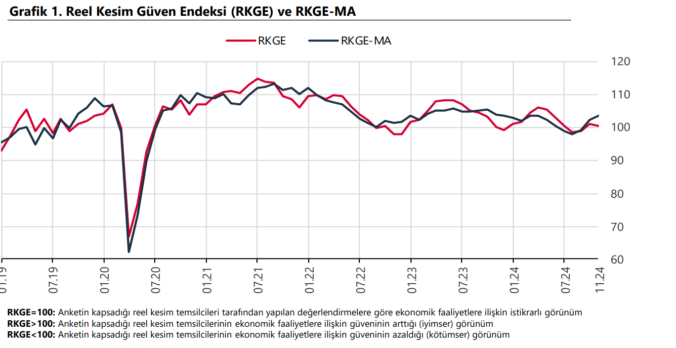 Türkiye Cumhuriyet Merkez Bankası (TCMB), kasım ayı reel kesim güven endeksi verilerini açıkladı. Mevsimsellikten arındırılmış reel kesim güven endeksi bir önceki aya göre 1,2 puan artışla 103,4 seviyesine yükseldi. Endeks böylece Nisan 2024'ten beri en yüksek düzeye çıktı. Kaynak: TCMB Endeksi oluşturan anket sorularına ait yayılma endeksleri incelendiğinde, son üç aydaki toplam sipariş miktarı, mevcut toplam sipariş miktarı, genel gidişat, mevcut mamul mal stoku, gelecek üç aydaki ihracat sipariş miktarı ve gelecek üç aydaki toplam istihdama ilişkin değerlendirmeler endeksi artış yönünde etkilerken, sabit sermaye yatırım harcamasına ilişkin değerlendirmeler endeksi azalış yönünde etkiledi. Gelecek üç aydaki üretim hacmine ilişkin değerlendirmeler ise bir önceki ay seviyesinde gerçekleşti. Mevsimsellikten arındırılmamış reel kesim güven endeksi bir önceki aya göre 0,5 puan azalarak 100,4'e geriledi.