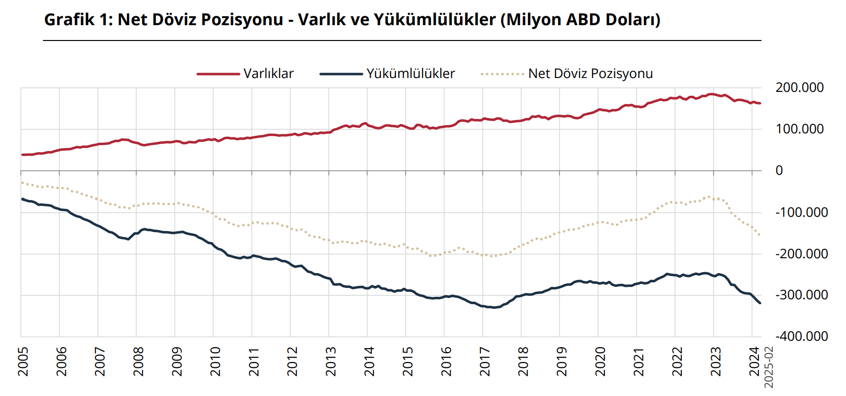 Finansal kesim dışındaki firmaların net döviz açığı şubatta 155 milyar 400 milyon dolar oldu. Türkiye Cumhuriyet Merkez Bankası (TCMB) verilerine göre, şubatta önceki aya kıyasla finansal kesim dışındaki firmaların döviz varlıkları 725 milyon dolar azalırken, yükümlülükler 6 milyar 599 milyon dolar arttı. Söz konusu firmaların net döviz pozisyonu açığı ise 7 milyar 324 milyon dolar artarak 155 milyar 400 milyon dolara çıktı. Kaynak: TCMB Şubatta varlık dağılımı incelendiğinde, önceki aya göre türev varlıklar, ihracat alacakları ve menkul kıymetler sırasıyla 719 milyon dolar, 505 milyon dolar ve 80 milyon dolar azaldı. Yurt dışına doğrudan sermaye yatırımları ve yurt içi bankalardaki mevduat sırasıyla 533 milyon dolar ve 46 milyon dolar arttı. Böylece varlıklar 725 milyon dolar geriledi. Yükümlülük dağılımında ise önceki aya göre yurt içinden sağlanan nakdi krediler, yurt dışından sağlanan nakdi krediler, türev yükümlülükler ve ithalat borçları sırasıyla 3 milyar 202 milyon dolar, 2 milyar 472 milyon dolar, 559 milyon dolar ve 366 milyon dolar yükseldi. Bunlara bağlı olarak yükümlülükler 6 milyar 599 milyon dolar artış kaydetti. Yükümlülüklerin vade yapısına bakıldığında, şubatta yurt içinden sağlanan kısa vadeli krediler, ocak ayına göre 2 milyar 323 milyon dolar artarken, uzun vadeliler 878 milyon dolar yükseldi. Yurt dışından sağlanan kredilerde ise kısa vadeli olanlar 254 milyon dolar artarken, uzun vadeli krediler 2 milyar 584 milyon dolar yükseldi. Şubatta kısa vadeli varlıklar 130 milyar 327 milyon dolar, kısa vadeli yükümlülükler 122 milyar 411 milyon dolar olarak gerçekleşti. Kısa vadeli net döviz pozisyonu fazlası ise 7 milyar 916 milyon dolar olarak ocak ayına göre 4 milyar 198 milyon dolar azaldı. Kısa vadeli yükümlülüklerin toplam yükümlülükler içindeki payı yüzde 38 oldu. [news_id:769939]