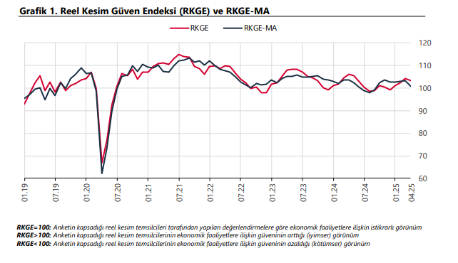 Mevsimsellikten arındırılmış Reel Kesim Güven Endeksi (RKGE) bir önceki aya göre 2,4 puan gerileyerek son 7 ayın en düşük seviyesine indi. Türkiye Cumhuriyet Merkez Bankası (TCMB), nisan ayı reel kesim güven endeksi verilerini açıkladı. Mevsimsellikten arındırılmış reel kesim güven endeksi bir önceki aya göre 2,4 puan azalarak 100,8 seviyesine geriledi. Böylelikle reel kesim güveni 2024 Eylül'den bu yana en düşük düzeye geriledi. Endeks martta 103,2, şubatta 102,8 düzeyindeydi. Endeksi oluşturan anket sorularına ait yayılma endeksleri incelendiğinde, mevcut mamul mal stoku, mevcut toplam sipariş miktarı ve sabit sermaye yatırım harcamasına ilişkin değerlendirmeler endeksi artış yönünde etkilerken, genel gidişat, gelecek üç aydaki üretim hacmi, gelecek üç aydaki toplam istihdam, son üç aydaki toplam sipariş miktarı ve gelecek üç aydaki ihracat sipariş miktarına ilişkin değerlendirmeler endeksi azalış yönünde etkiledi. Mevsimsellikten arındırılmamış Reel Kesim Güven Endeksi (RKGE) ise bir önceki aya göre 0,9 puan azalarak 103,2 seviyesinde gerçekleşti. Kaynak: TCMB
