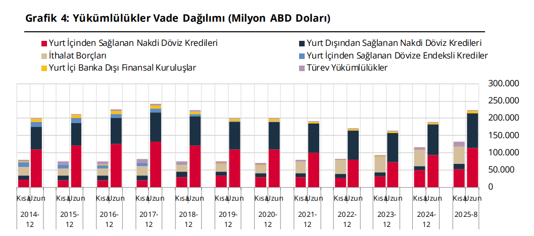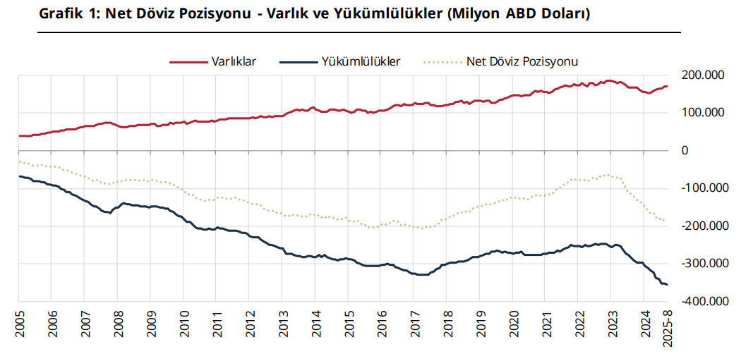 Finansal kesim dışındaki firmaların net döviz açığı ağustos ayında 3 milyar 1 miyon dolar artışla 184 milyar 934 milyon dolara yükseldi. Türkiye Cumhuriyet Merkez Bankası (TCMB) verilerine göre ağustos ayında önceki aya kıyasla finansal kesim dışındaki firmaların döviz varlıkları 787 milyon dolar, yükümlülükleri ise 3 milyar 788 milyon dolar artış gösterdi. Söz konusu firmaların net döviz pozisyonu açığı ağustos ayında 3 milyar dolar artarak 184 milyar 934 milyon dolara yükseldi. Kaynak: TCMB Ağustos 2025 dönemi varlık dağılımı incelendiğinde; bir önceki aya göre yurt dışına doğrudan sermaye yatırımları, ihracat alacakları ve menkul kıymetler sırasıyla 747 milyon dolar, 405 milyon dolar ve 58 milyon dolar artarken türev varlıklar ve yurt içi bankalardaki mevduat sırasıyla 246 milyon dolar ve 176 milyon dolar azaldı. Bunlara bağlı olarak varlıklar 787 milyon dolar arttı. Yükümlülük dağılımında ise bir önceki aya göre yurt içinden sağlanan nakdi krediler, yurt dışından sağlanan krediler ve türev yükümlülükler sırasıyla 2.024 milyon dolar, 1.852 milyon dolar ve 606 milyon dolar artarken, ithalat borçları 694 milyon dolar azalış ve bunlara bağlı olarak yükümlülükler 3.788 milyon dolar artış gösterdi.