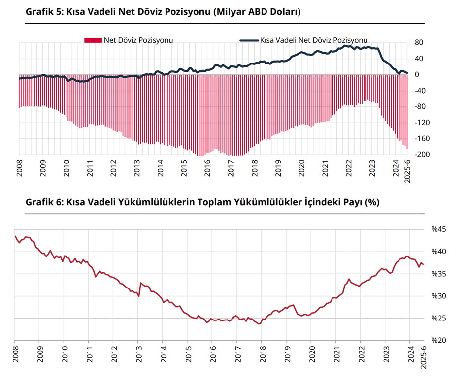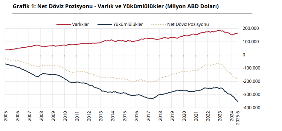 Finansal kesim dışındaki firmaların net döviz açığı haziranda 185 milyar 793 milyon dolar oldu. Reel sektörün döviz açığı böylece Eylül 2018'den bu yana en yüksek düzeye ulaştı. Türkiye Cumhuriyet Merkez Bankası (TCMB) verilerine göre, haziranda önceki aya kıyasla finansal kesim dışındaki firmaların döviz varlıkları 1 milyar 378 milyon dolar, yükümlülükler 9 milyar 732 milyon dolar arttı. Söz konusu firmaların net döviz pozisyonu açığı ise 8 milyar 355 milyon dolar artarak 185 milyar 793 milyon dolara çıktı. Reel sektörün döviz açığı böylece Eylül 2018'den bu yana en yüksek düzeye ulaştı. Haziran 2025 dönemi varlık dağılımı incelendiğinde, bir önceki aya göre yurt dışına doğrudan sermaye yatırımları, türev varlıklar, ihracat alacakları ve menkul kıymetler sırasıyla 869 milyon dolar, 869 milyon dolar, 187 milyon dolar ve 30 milyon dolar artarken, yurt içi bankalardaki mevduat 578 milyon dolar azaldı ve sonuç olarak varlıklar 1 milyar 378 milyon dolar arttı. Yükümlülük dağılımında ise bir önceki aya göre yurt içinden sağlanan nakdi krediler, yurt dışından sağlanan nakdi krediler, türev yükümlülükler ve ithalat borçları sırasıyla 4 milyar 905 milyon dolar, 3 milyar 92 milyon dolar, 1 milyar 306 milyon dolar ve 428 milyon dolar arttı ve bunlara bağlı olarak yükümlülükler 9 milyar 732 milyon dolar yükseldi. Yükümlülüklerin vade yapısına bakıldığında, haziran döneminde yurt içinden sağlanan kısa vadeli krediler mayıs dönemine göre 546 milyon dolar, uzun vadeli olanlar 4 milyar 359 milyon dolar arttı. Yurt dışından sağlanan kredilerde ise kısa vadeli olanlar 784 milyon dolar artış kaydederken, uzun vadeli krediler de 2 milyar 736 milyon dolar yükseldi. Haziran döneminde kısa vadeli varlıklar 134 milyar 867 milyon dolar seviyesinde gerçekleşirken, kısa vadeli yükümlülükler 130 milyar 376 milyon dolar oldu. Kısa vadeli net döviz pozisyonu fazlası ise 2 milyar 38 milyon dolar gerileyerek 4 milyar 492 milyon dolar oldu. Kısa vadeli yükümlülüklerin toplam yükümlülükler içindeki payı ise yüzde 37 düzeyinde gerçekleşti. Kaynak: TCMB