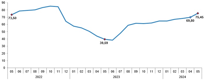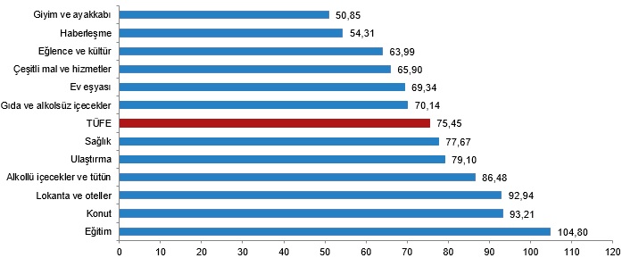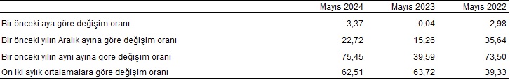 Türkiye İstatistik Kurumu (TÜİK), mayıs ayına ilişkin resmi enflasyon rakamlarını açıkladı. TÜİK verilerine göre enflasyon mayıs ayında yıllık bazda yüzde 75,45 artış kaydetti. Bu döneme ilişkin piyasaların genel beklentisi ise enflasyonun yüzde 74,80 seviyesinde gerçekleşmesi yönündeydi. Kaynak: TÜİK Aylık bazda beklenti yüzde 3 seviyesinde olurken, aylık artış ise yüzde 3,37 olarak kayıtlara geçti. TÜFE'deki (2003=100) değişim 2024 yılı Mayıs ayında bir önceki yılın Aralık ayına göre yüzde 22,72, on iki aylık ortalamalara göre yüzde 62,51 olarak gerçekleşti. Kaynak: TÜİK Bir önceki yılın aynı ayına göre en az artış gösteren ana grup yüzde 50,85 ile giyim ve ayakkabı oldu. Buna karşılık, bir önceki yılın aynı ayına göre artışın en yüksek olduğu ana grup ise yüzde 104,80 ile eğitim oldu. Kaynak: TÜİK Ana harcama grupları itibarıyla 2024 yılı Mayıs ayında bir önceki aya göre en az artış gösteren ana grup yüzde 1,01 ile haberleşme oldu. Buna karşılık, 2024 yılı Mayıs ayında bir önceki aya göre artışın en yüksek olduğu ana grup ise yüzde 9,60 ile giyim ve ayakkabı oldu. Kaynak: TÜİK Endekste kapsanan 143 temel başlıktan (Amaca Göre Bireysel Tüketim Sınıflaması-COICOP 5'li Düzey) 2024 yılı Mayıs ayı itibarıyla, 23 temel başlığın endeksinde düşüş gerçekleşirken, 6 temel başlığın endeksinde değişim olmadı. 114 temel başlığın endeksinde ise artış gerçekleşti. Özel kapsamlı TÜFE göstergesi (B) yıllık yüzde 72,99 arttı İşlenmemiş gıda ürünleri, enerji, alkollü içkiler ve tütün ile altın hariç TÜFE'deki değişim, 2024 yılı Mayıs ayında bir önceki aya göre yüzde 3,77, bir önceki yılın Aralık ayına göre yüzde 23,05, bir önceki yılın aynı ayına göre yüzde 72,99 ve on iki aylık ortalamalara göre yüzde 66,53 olarak gerçekleşti. ENAG ve İTO'nun enflasyon hesabı Enflasyon Araştırma Grubu’nun (ENAG) hesaplamalarına göre ise enflasyon (E-TÜFE) mayıs ayında aylık bazda yüzde 5,66, yıllık bazda ise yüzde 120,66 artış göstermişti. İstanbul Ticaret Odası (İTO) ise cumartesi günü İstanbul'da perakende fiyatların aylık bazda yüzde 3,59, yıllık bazda ise yüzde 82,20 artış kaydettiğini bildirmişti. [news_id:734743] [news_id:734875]