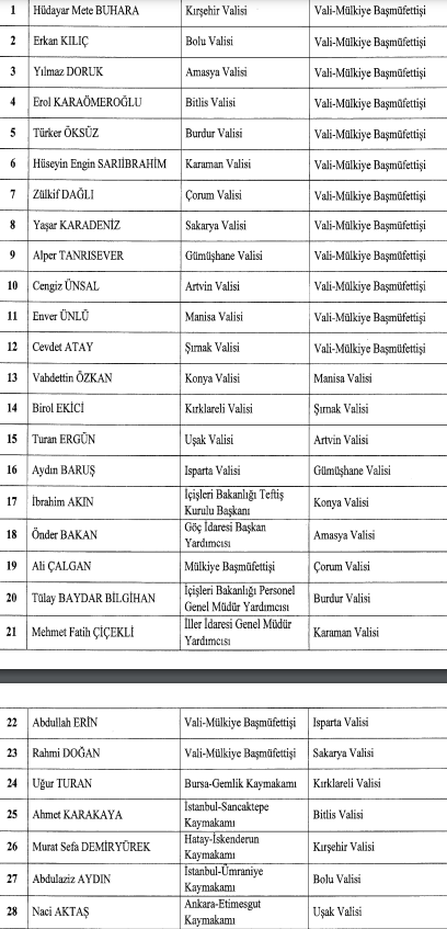 Resmi Gazete'de yayımlanan Valiler Kararnamesi ile 16 ilin valisi değişirken 12 ilin valisi vali-mülkiye başmüfettişliğine getirildi. Cumhurbaşkanı Recep Tayyip Erdoğan'ın imzasıyla aralarında Konya, Kırşehir, Bolu ve Manisa'nın da olduğu 16 ilin valisi değiştirildi. 12 kentin valisi ise "vali-mülkiye başmüfettişliği" görevine getirildi. Resmi Gazete'de yayımlanan karara göre; Konya Valisi Vahdettin Özkan, Manisa Valiliği'ne, Kırklareli Valisi Birol Ekici, Şırnak Valiliği'ne, Uşak Valisi Turan Ergün, Artvin Valiliği'ne, Isparta Valisi Aydın Baruş, Gümüşhane Valiliği'ne, İçişleri Başkanlığı Teftiş Kurulu Başkanı İbrahim Akın, Konya Valiliği'ne, Göç İdaresi Başkan Yardımcısı Önder Bakan, Amasya Valiliği'ne, Mülkiye Başmüfettişi Ali Çalgan, Çorum Valiliği'ne, İçişleri Bakanı Personel Genel Müdür Yardımcısı Tülay Baydar Bilgihan, Burdur Valiliği'ne, İller İdaresi Genel Müdür Yardımcısı Mehmet Fatih Çiçekli, Karaman Valiliği'ne, Vali-Mülkiye Başmüfettişi Abdullah Erin, Isparta Valiliği'ne, Vali-Müliye Başmüfettişi Rahmi Doğan, Sakarya Valiliği'ne, Bursa Gemlik Kaymakamı Uğur Turan, Kırklareli Valiliği'ne, İstanbul-Sancaktepe Kaymakamı Ahmet Karakaya, Bitlis Valiliği'ne, Hatay-İskenderun Kaymakamı Murat Sefa Demiryürek, Kırşehir Valiliği'ne, İstanbul-Ümraniye Kaymakamı Abdulaziz Aydın, Bolu Valiliği'ne, Ankara-Etimesgut Kaymakamı Naci Aktaş, Uşak Valiliği'ne atandı. Mülkiye başmüfettişliğine getirilenler Cumhurbaşkanı Erdoğan imzasıyla Resmi Gazete'de yayımlanan kararnameye göre Hüdayar Mete Buhara, Erkan Kılıç, Yılmaz Doruk, Erol Karaömeroğlu, Türker Öksüz, Hüseyin Engin Sarıibrahim, Zülkif Dağlı, Yaşar Karadeniz, Alper Tanrısever, Cengiz Ünsal, Enver Ünlü ve Cevdet Atay ise "Vali-Mülkiye Başmüfettişliği" görevine getirildi. Kaynak: Resmi Gazete