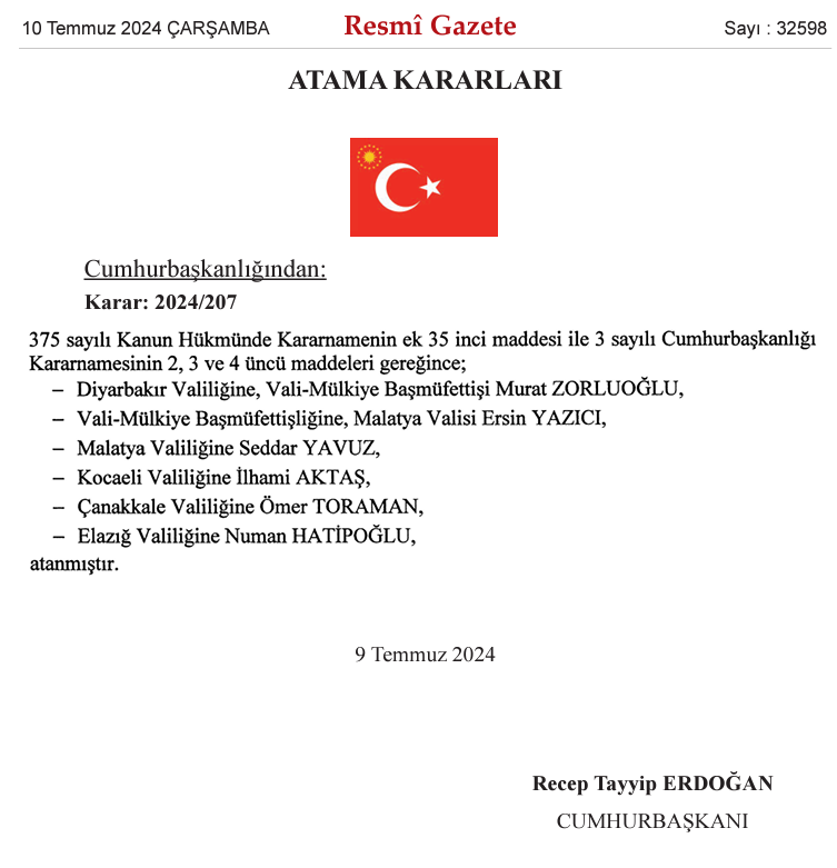 Resmi Gazete'de yayımlanan Cumhurbaşkanlığı atamalarına göre Diyarbakır, Malatya, Kocaeli, Çanakkale ve Elazığ valiliklerine yeni isimler atandı. Cumhurbaşkanlığı tarafından yapılan atamalar hakkında karar, Resmi Gazete'de yayımlandı. Cumhurbaşkanı Recep Tayyip Erdoğan imzasıyla yayımlanan karara göre, Diyarbakır Valiliğine Vali-Mülkiye Başmüfettişi Murat Zorluoğlu, Malatya Valiliğine Seddar Yavuz, Kocaeli Valiliğine İlhami Aktaş, Çanakkale Valiliğine Ömer Toraman ve Elazığ Valiliğine Numan Hatipoğlu atandı. Malatya Valisi Ersin Yazıcı'nın ise Vali-Mülkiye Başmüfettişliği görevine ataması yapıldı. Kaynak: Resmi Gazete [news_id:739060]