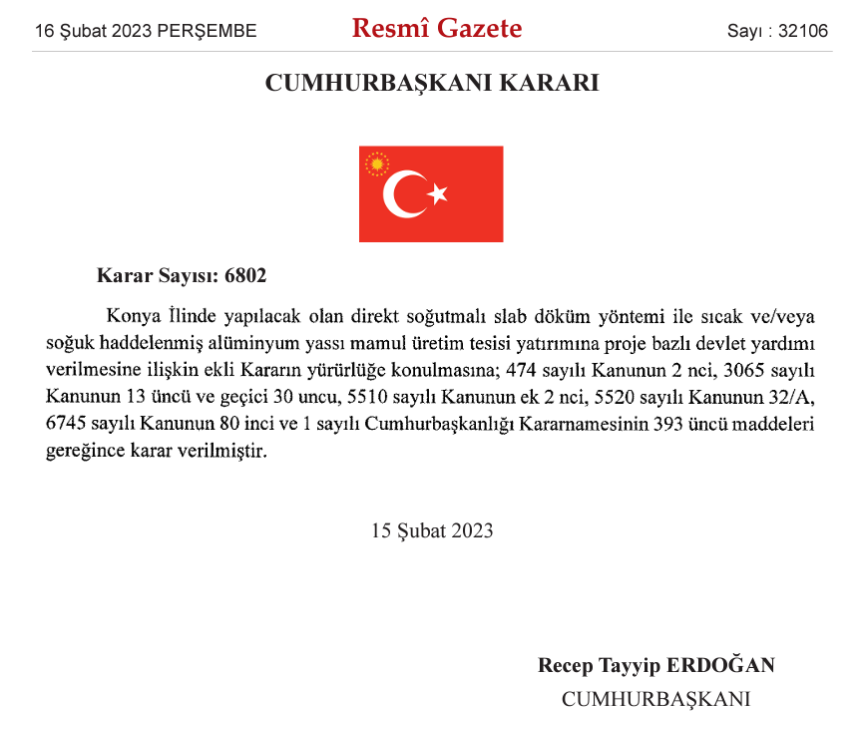 2005'te Cengiz Holding bünyesine katılan Eti Alüminyum AŞ'nin Konya'da yapacağı yatırım projesine, yüzde 100 vergi indirimi ve yüzde 85 yatırıma katkı oranı olmak üzere gümrük vergisi muafiyeti, KDV istisnası, KDV iadesi, vergi indirimi, azami tutar sınırı olmaksızın 10 yıl sigorta primi işveren hissesi desteği, azami 75 milyon TL nitelikli personel desteği ve 200 milyon lirayı aşmayacak enerji desteği gibi birçok destek verilecek. Eti Alüminyum AŞ tarafından Konya'da yapılacak direkt soğutmalı slab döküm yöntemi ile sıcak ve/veya soğuk haddelenmiş alüminyum yassı mamul üretim tesisi yatırımına proje bazlı devlet yardımı verilecek. Konuya ilişkin Cumhurbaşkanı Kararı, Resmi Gazete'de yayımlanarak yürürlüğe girdi. Kaynak: Resmi Gazete Buna göre, söz konusu yatırımının süresi 5 yıl olarak belirlendi. Yatırımın öngörülen sürede gerçekleştirilememesi halinde Sanayi ve Teknoloji Bakanlığı tarafından bu sürenin yarısı kadar daha ek süre verilebilecek. Geçen yıl 1 Aralık'ta başlayan projenin öngörülen sabit yatırım tutarı 3 milyar 10 milyon 545 bin 522 lira olarak tespit edildi. Yatırımla öngörülen ilave istihdam 285, öngörülen nitelikli personel sayısı ise 45 oldu. Yatırım süresi sonunda yılda 100 bin ton sıcak ve/veya soğuk haddelenmiş alüminyum yassı mamul üretilmesi planlanıyor. Yatırım projesi, gümrük vergisi muafiyeti (vergi indirim oranı yüzde 100, yatırıma katkı oranı yüzde 85, yatırım katkı tutarının yatırım döneminde kullanılabilecek oranı yüzde 100), KDV istisnası, KDV iadesi, vergi indirimi, sigorta primi işveren hissesi desteği (azami tutar sınırı olmaksızın 10 yıl), nitelikli personel desteği (azami 75 milyon TL), enerji desteği (işletmeye geçiş tarihinden itibaren 10 yıla kadar 200 milyon lirayı aşmamak üzere enerji tüketim harcamalarının yüzde 50'si) gibi teşviklerden yararlanacak. Personel desteği 5 yıl Nitelikli personel desteği, her bir nitelikli personel için asgari ücretin aylık brüt tutarının 20 katını geçmemek üzere 5 yıl uygulanacak. Enerji desteği, kısmen işletmeye geçildiğinin Bakanlıkça tespit edildiği veya yatırımın tamamlama vizesinin yapıldığı ayı takip eden aydan itibaren Kararda belirlenen oran ve süre aşılmamak kaydıyla azami destek tutarına ulaşıncaya kadar devam edecek. Yatırımın tamamlanmasını müteakip, tamamlama vizesi için firma tarafından Bakanlığa müracaat edilecek. Karar hükümleri Sanayi ve Teknoloji Bakanı'nca yürütülecek.