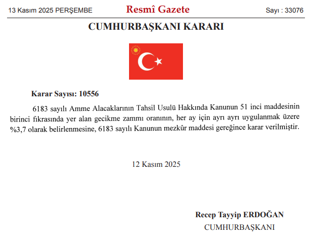 Kamu alacaklarının süresinde ödenmemesi nedeniyle uygulanan aylık gecikme zammı oranının yüzde 3,7'ye, kamu alacaklarının tecil ve taksitlendirilmesi halinde uygulanan yıllık tecil faizinin de yüzde 39'a indirilmesi kararlaştırıldı. Resmi Gazete'de yayımlanan Cumhurbaşkanlığı kararına göre kamu alacaklarının süresinde ödenmemesi nedeniyle uygulanan gecikme zammı oranı yeniden belirlendi. Kamu alacaklarının taksitlendirilmesi halinde alınan tecil faizi oranı da bugünden itibaren yürürlüğe giren Tahsilat Genel Tebliği ile tespit edildi. Hazine ve Maliye Bakanlığından edinilen bilgilere göre bu düzenlemelerle gecikme zammı ve tecil faiz oranları düşürüldü. Bu kapsamda Amme Alacaklarının Tahsil Usulü Hakkında Kanun'da yer alan gecikme zammı oranı, her ay için ayrı ayrı uygulanmak üzere aylık yüzde 3,7'ye indirildi. Kamu alacaklarının ödemesinin gecikmesinden dolayı tatbik edilen gecikme zammı oranı, karardan önce aylık yüzde 4,5 olarak uygulanıyordu. Tebliğle de kamu alacaklarının taksitlendirilmesi halinde alınan tecil faizi oranı ise yıllık yüzde 48'den yüzde 39'a düşürüldü. Bu düzenlemeden önce tecil edilerek ödenmesi gereken kamu alacaklarının taksit tutarlarına eski oranda, bugünden itibaren olanlara da yıllık yüzde 39 tecil faizi uygulanacak. Öte yandan, düşürülen faiz oranları nedeniyle yeniden yapılandırma benzeri düzenlemelere gerek kalmayacağı, mükelleflere taksitlendirme yolunun açık olduğu bildirildi. Kaynak: Resmi Gazete