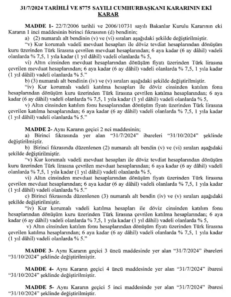 Kur korumalı mevduata (KKM) uygulanan vergi avantajı kaldırıldı. Söz konusu hesaplar için yüzde 5-7,5 arasında stopaj uygulanacağı bildirildi. Cumhurbaşkanlığı'nın konu ile ilgili kararı Resmi Gazete'de yayımlandı. Buna göre, kur korumalı vadeli mevduat hesapları ile döviz tevdiat hesaplarından dönüşüm kuru üzerinden Türk lirasına çevrilen mevduat hesaplarından; 6 aya kadar (6 ay dâhil) vadeli olanlarda yüzde 7,5, 1 yıla kadar (1 yıl dâhil) vadeli olanlarda yüzde 5, altın cinsinden mevduat hesaplarından dönüşüm fiyatı üzerinden Türk lirasına çevrilen mevduat hesaplarından; 6 aya kadar (6 ay dâhil) vadeli olanlarda yüzde 7,5, 1 yıla kadar (1 yıl dâhil) vadeli olanlarda yüzde 5 stopaj uygulanacak. Kaynak: Resmi Gazete