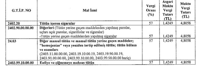 Tütün ürünlerinde 'ÖTV' düzenlemesi Resmi Gazete'de yayımlandı. Resmi Gazete'de yayınlanan 4760 sayılı Özel Tüketim Vergisi Kanununda yer alan bazı mallara uygulanan özel tüketim vergisi oranları, asgari maktu ve maktu vergi tutarlarının yeniden belirlenmesi ile bu mallarda 2024 yılı Ocak-Haziran dönemi için uygulanmaması hakkındaki ekli Kararın yürürlüğe konulmasına, 4760 sayılı Kanunun mezkür maddesi gereğince karar verildi. Resmi Gazete'nin bugünkü sayısında yayımlanan ÖTV kanunun eki (III) sayılı listenin (B) cetvelinde yer alan ürünlerden bazılarının ÖTV oranı ile asgari maktu ÖTV tutarlarını yeniden belirleyen Cumhurbaşkanı kararına göre, sigara ve bazı tütün ürünlerinden alınan ÖTV oranı yüzde 63'ten yüzde 57'ye düşürülürken, asgari maktu ÖTV tutarları 1.1114 TL'den 1.4249 TL'ye yükseltildi. Kaynak: Resmi Gazete