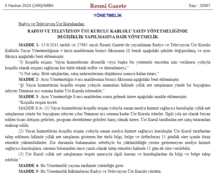 Resmi Gazete'de yayımlanan karara göre medya hizmet sağlayıcı kuruluşlar ve internet platform işletmecileri bir yıllık net satışlarının yüzde bir buçuğunu RTÜK'e ödeyecek. Radyo, Televizyon ve İsteğe Bağlı Yayınların İnternet Ortamından Sunumu Hakkında Yönetmelikte Değişiklik Yapılmasına Dair Yönetmelik ile Radyo ve Televizyon Üst Kurulu'nun Uydu Yayın ve Kablolu Yayın Yönetmeliğinde Değişiklik Yapılmasına Dair Yönetmelikler Resmi Gazete'de yayımlandı. Yönetmeliklerle birlikte; yayın hizmetlerini koşullu erişim yoluyla sağlayan medya hizmet sağlayıcı kuruluşlar ve internet platform işletmecileri yıllık net satışlarının yüzde bir buçuğunu izleyen yılın Temmuz ayı sonuna kadar RTÜK'e ödeyecek. Yayın hizmetlerini koşullu erişim yoluyla sunan medya hizmet sağlayıcı kuruluşlar Üst Kurul tarafından talep edilmesi hâlinde yıllık net satışlarını gösteren her türlü bilgi, belge ve defterlerini 15 günlük süre içinde ibraz etmekle yükümlü olacak. Zor durumda bulunmaları sebebiyle bu yükümlülüğü yerine getiremeyen medya hizmet sağlayıcı kuruluşlara, sürenin bitiminden önce yazılı olarak talep etmeleri halinde 15 gün ek süre verilebilecek. Kaynak: Resmi Gazete [news_id:725312]