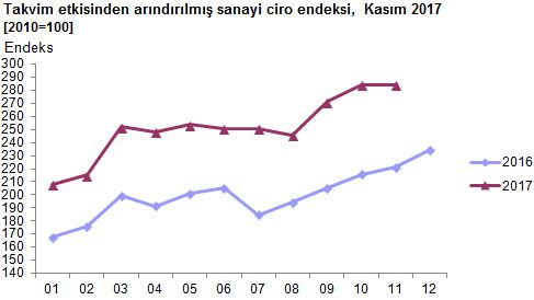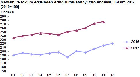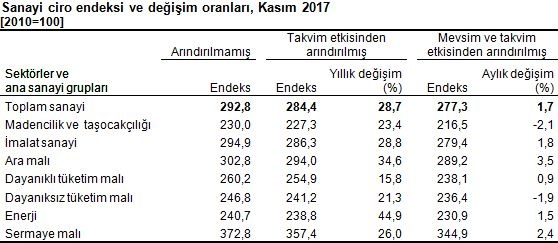 Türkiye İstatistik Kurumu (TÜİK) tarafından Cuma günü açıklanan Sanayi Ciro Endeksi verilerine göre Sanayi Ciro Endeksi, Kasım ayında aylık bazda %1,7 ve yıllık bazda %28,7 yükseldi. Sanayi ciro endeksi yıllık bazda %28,7 yükseldi Takvim etkisinden arındırılmış sanayi alt sektörleri Kasım ayı endekslerine göre bir önceki yılın aynı ayına kıyasla madencilik ve taşocakçılığı sektörü endeksi %23,4 ve imalat sanayi sektörü endeksi %28,8 yükseliş kaydetti. Sanayi ciro endeksi aylık bazda %1,7 yükseldi Mevsim ve takvim etkilerinden arındırılmış sanayi alt sektörleri Kasım ayı endekslerine göre bir önceki aya kıyasla madencilik ve taşocakçılığı sektörü endeksi %2,1 azalırken imalat sanayi sektörü endeksi %1,8 yükseldi.