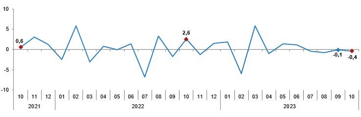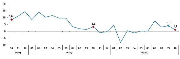 Sanayi üretim endeksi, ekimde aylık bazda yüzde 0,4 azalırken yıllık bazda yüzde 1,1 artış gösterdi. Türkiye İstatistik Kurumu (TÜİK), ekim ayına ilişkin sanayi üretim endeksi sonuçlarını açıkladı. Verilere göre sanayi üretimi yıllık %1,1 artış kaydetti. Sanayinin alt sektörleri (2015=100 referans yıllı) incelendiğinde, 2023 yılı Ekim ayında madencilik ve taş ocakçılığı sektörü endeksi bir önceki yılın aynı ayına göre %3,7, imalat sanayi sektörü endeksi %1,3 ve elektrik, gaz, buhar ve iklimlendirme üretimi ve dağıtımı sektörü endeksi %3,5 arttı. Kaynak: TÜİK Verilere göre sanayi üretimi aylık bazda ise %0,4 gerileme kaydetti. Sanayinin alt sektörleri incelendiğinde, 2023 yılı Ekim ayında madencilik ve taş ocakçılığı sektörü endeksi bir önceki aya göre %3,2 artarken, imalat sanayi sektörü endeksi %0,3 ve elektrik, gaz, buhar ve iklimlendirme üretimi ve dağıtımı sektörü endeksi %2,3 azaldı. Bu konu ile ilgili bir sonraki haber bülteninin yayımlanma tarihi 10 Ocak 2024'tür.
