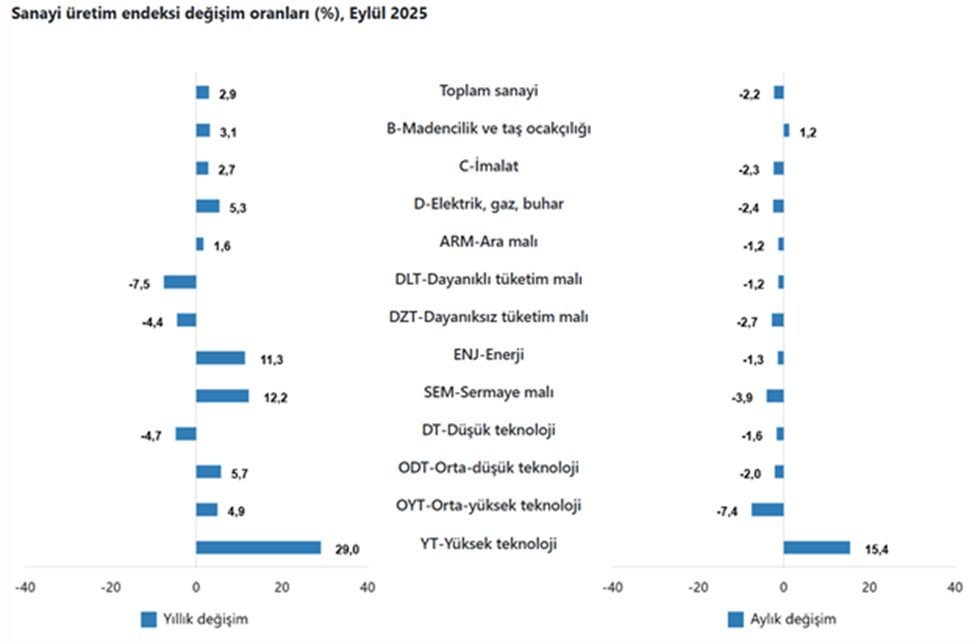 Türkiye İstatistik Kurumu (TÜİK) verilerine göre takvim etkisinden arındırılmış sanayi üretimi eylülde aylık bazda yüzde 2,2 azalış kaydetti. Türkiye İstatistik Kurumu (TÜİK), eylül ayına ilişkin sanayi üretim endeksi verilerini açıkladı. Söz konusu ayda takvim etkisinden arındırılmış sanayi üretimi, geçen yılın aynı ayına kıyasla yüzde 2,9 yükseldi. Sanayinin alt sektörleri (2021=100 referans yıllı) incelendiğinde, 2025 yılı Eylül ayında madencilik ve taş ocakçılığı sektörü endeksi bir önceki yılın aynı ayına göre %3,1 arttı, imalat sanayi sektörü endeksi %2,7 arttı ve elektrik, gaz, buhar ve iklimlendirme üretimi ve dağıtımı sektörü endeksi %5,3 arttı. Sanayi üretimi aylık %2,2 azaldı Söz konusu ayda takvim etkisinden arındırılmış sanayi üretimi aylık bazda yüzde 2,2 düşüş kaydetti. Sanayinin alt sektörleri incelendiğinde, 2025 yılı Eylül ayında madencilik ve taş ocakçılığı sektörü endeksi bir önceki aya göre %1,2 arttı, imalat sanayi sektörü endeksi %2,3 azaldı ve elektrik, gaz, buhar ve iklimlendirme üretimi ve dağıtımı sektörü endeksi %2,4 azaldı. Kaynak: TÜİK