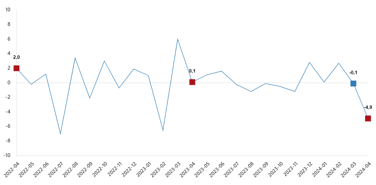 TÜİK'e göre sanayi üretimi yıllık bazda yüzde 0,7 azalırken aylık bazda yüzde 4,9 gerileme kaydetti. Türkiye İstatistik Kurumu (TÜİK) 2024 Nisan dönemine ilişkin sanayi üretimi verilerini yayımladı. TÜİK'e göre sanayi üretimi yıllık yüzde 0,7 azaldı. Sanayinin alt sektörleri (2021=100 referans yıllı) incelendiğinde, 2024 yılı Nisan ayında madencilik ve taş ocakçılığı sektörü endeksi bir önceki yılın aynı ayına göre yüzde 12,2 arttı, imalat sanayi sektörü endeksi yüzde 1,5 azaldı ve elektrik, gaz, buhar ve iklimlendirme üretimi ve dağıtımı sektörü endeksi yüzde 1,6 arttı. Sanayi üretimi aylık bazda ise yüzde 4,9 gerileme kaydetti. Kaynak: TÜİK Sanayinin alt sektörleri incelendiğinde, 2024 yılı Nisan ayında madencilik ve taş ocakçılığı sektörü endeksi bir önceki aya göre yüzde 1,3 azaldı, imalat sanayi sektörü endeksi yüzde 5,3 azaldı ve elektrik, gaz, buhar ve iklimlendirme üretimi ve dağıtımı sektörü endeksi yüzde 2,7 azaldı. [news_id:736253]